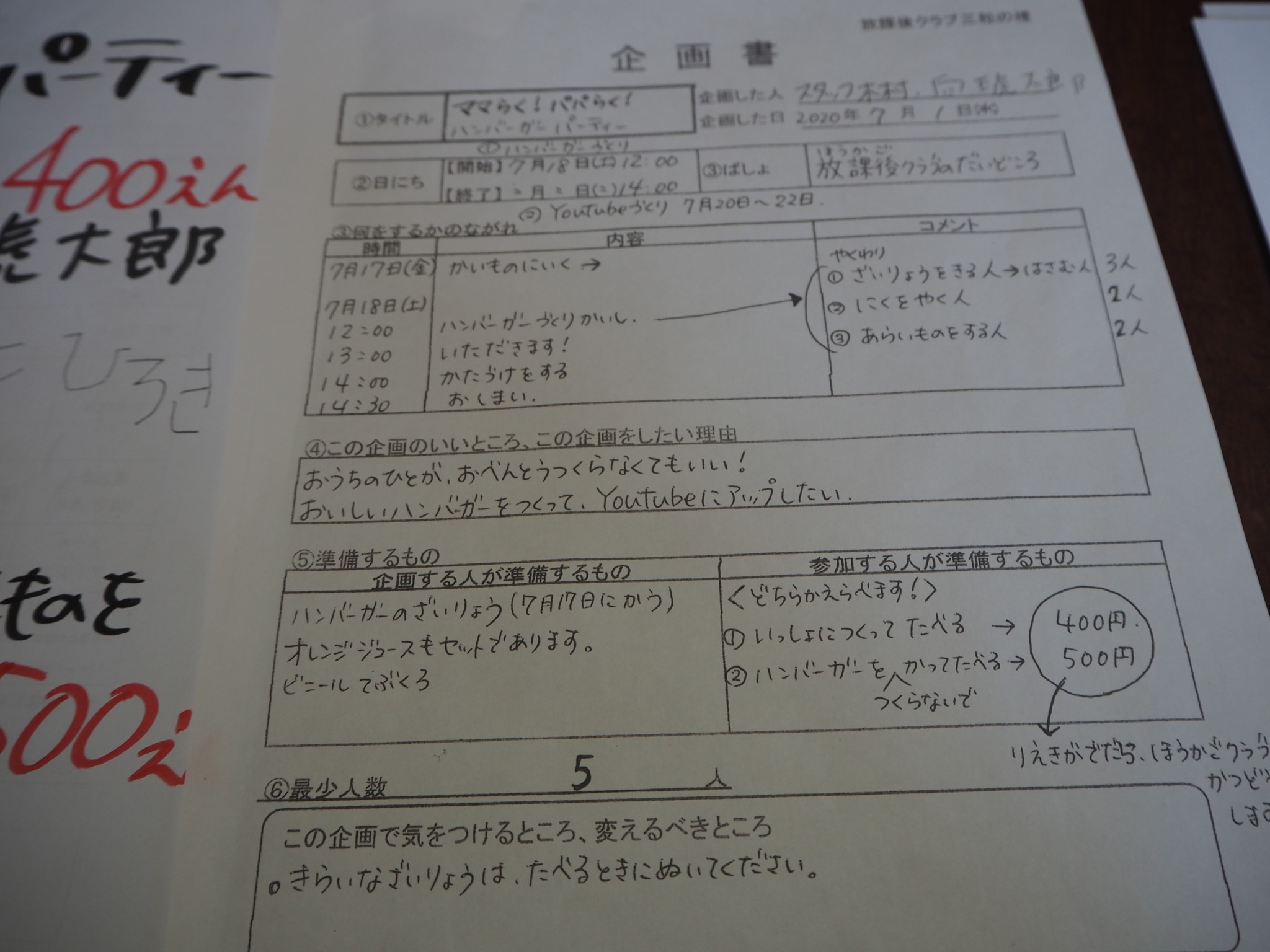 ある日提出されたのは、「ハンバーガーパーティー」の企画書。きっかけは、クラブのおやつで出たフライドポテトでした。ジャンクフードが大好きな小学1年生の男の子は、涙を流して大喜びしたそうです。「じゃあ、今度はみんなでハンバーガーを作るか?」スタッフの言葉にまたうれし涙。「面白そう!」と飛びついたのは小4男子。You Tubeを見てハンバーガーの作り方を調べ、スーパーに行って原価計算をして企画書を書きあげました。出来上がった企画書のタイトルは「ママらく! パパらく! ハンバーガーパーティー」。お弁当を持ってくる土曜日にお父さんお母さんに楽してもらおう!と、材料費のスポンサーとなる保護者の思いも汲み取った企画になりました。