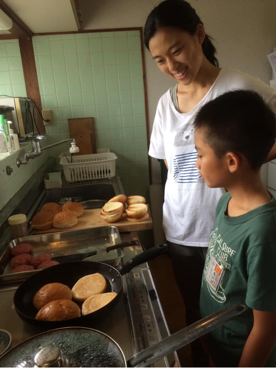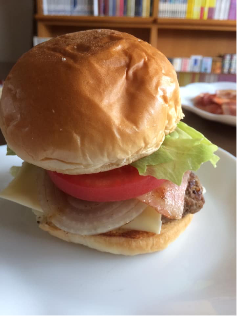 待ちに待った、パーティー当日。手づくりのパティ、ベーコン、チーズ、トマト、玉ねぎ、レタス・・・。子どもたちの口には入りきらないほど大きなハンバーガーが出来上がりました。せっせとお手伝いしていた1年生の男の子は、ハンバーガーを前に獣のような喜びを表現してくれました。