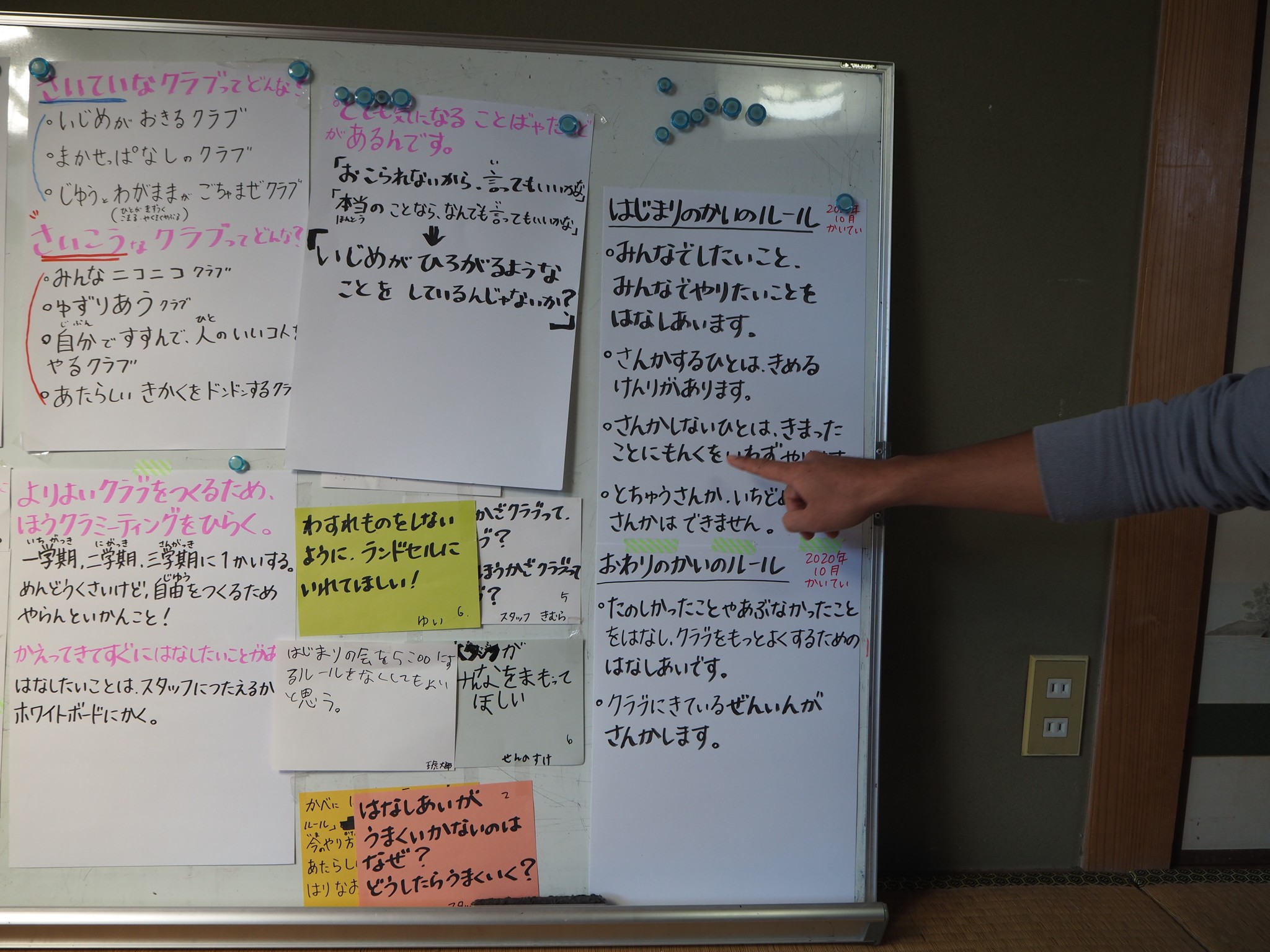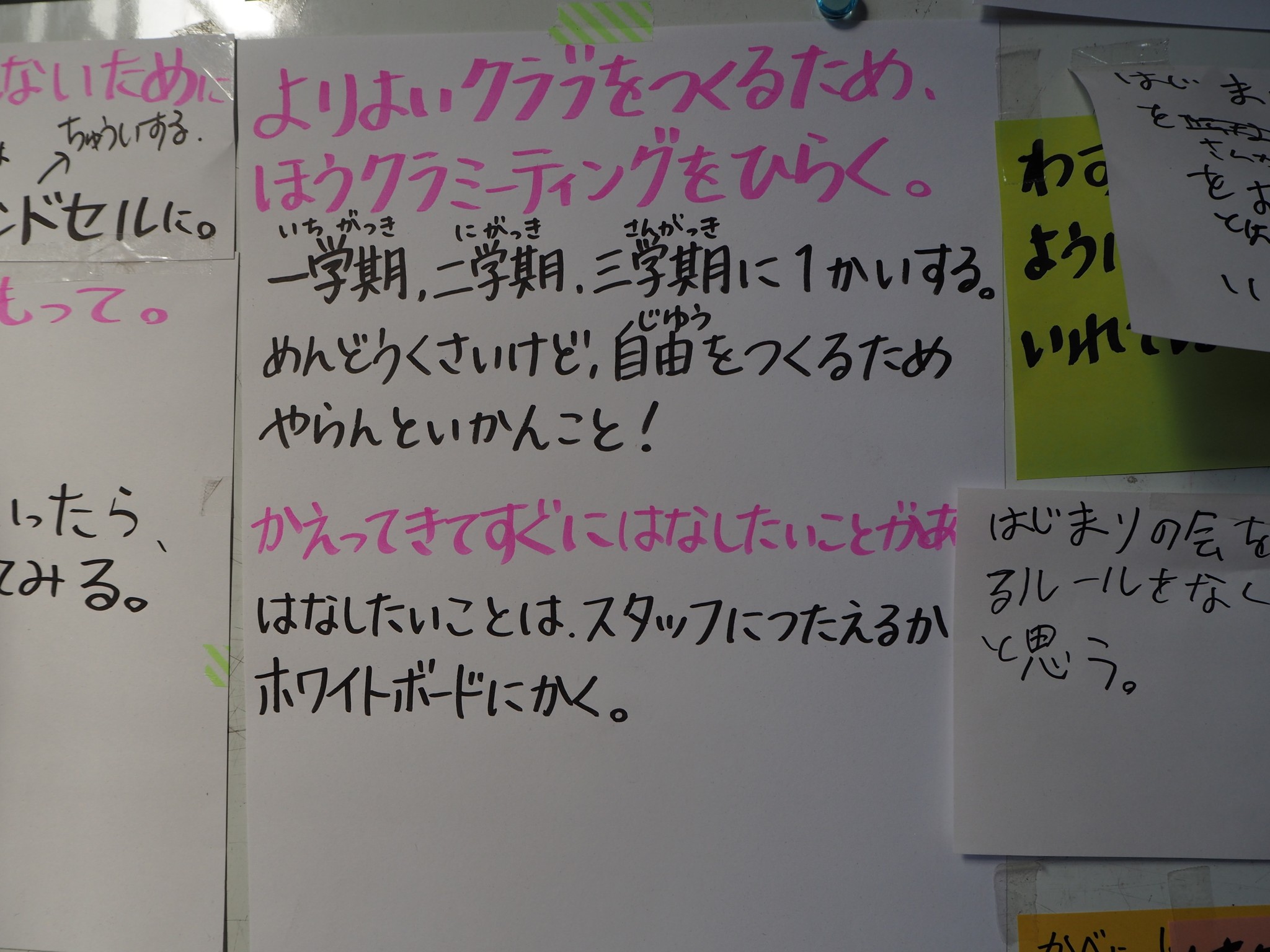 「自由にやりたいことをする」ためには、話し合いをしたり、企画書を書いたり、ルールを決めたり…と、面倒なことが多くあります。ですが、一人の小1の子どもがある日「話し合いに出たくない」と言い出した時、別の小1の子どもが「でも、やらんといかんことやけん。それが放課後クラブの《自由》やけん」と言いったそうです。
