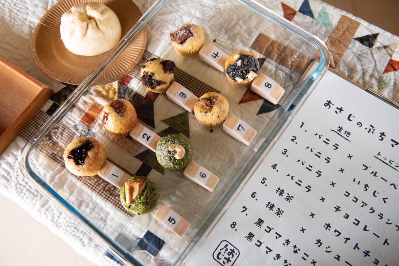 カフェのメニューは西粟倉村から来ている「手作りおやつの販売おさじ」が提供。ぷちマフィン、ビスコッティ、ロールケーキなど、どれにしようか迷ってしまうほど種類豊富で、すべて「おさじ」店主の桝岡さんの手作りです。