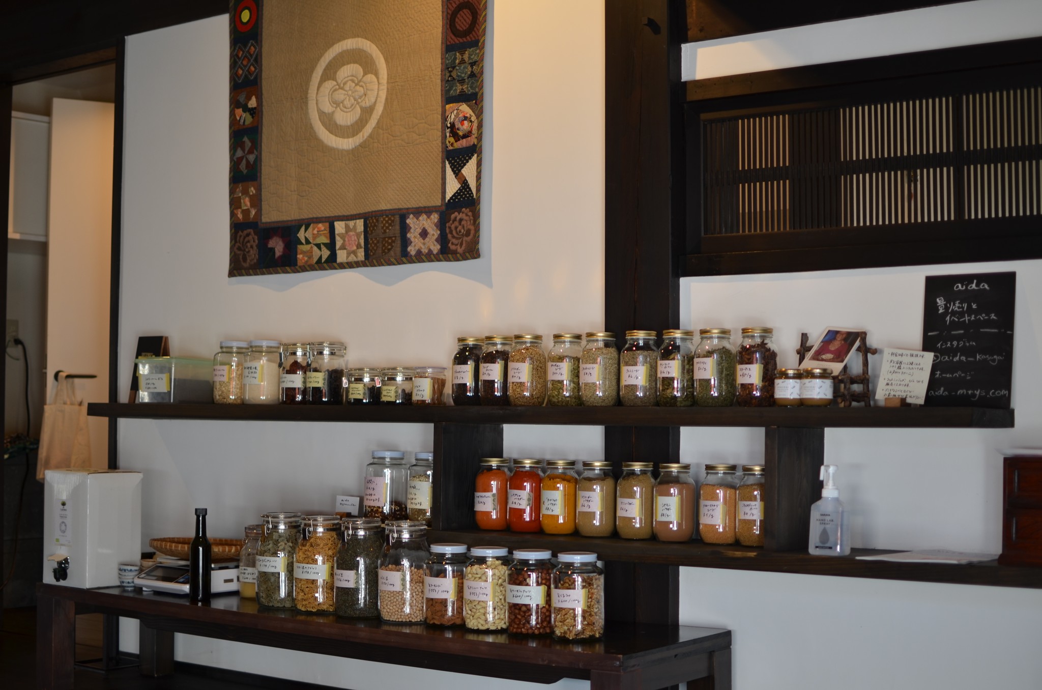 「店名のaidaには2つの意味がある」と川口さん。「間」と「愛だ」。「間」は人と人との間、古いものと新しいものの間、日常と非日常の間の3つから。「愛だ」は大好きなビートルズの「All you need is love」という曲から。「結局すべては愛だ」と川口さん。「わざわざ自分で容器を持ってきて自分で量って買う手間の豊かさもある」「『不便だけどそっちも楽しいじゃん』と工夫するおもしろさを体験してほしい」と語ってくれました。