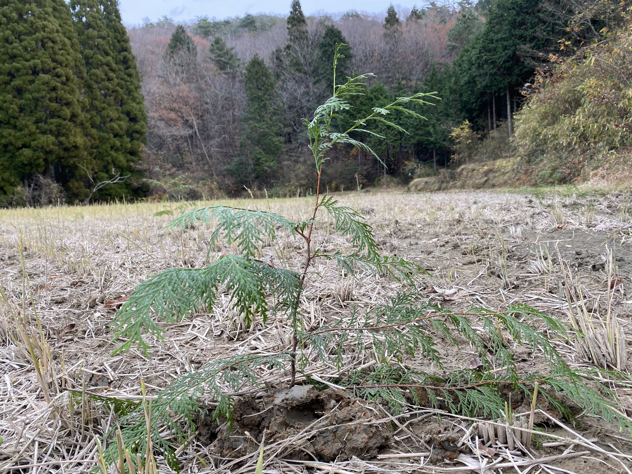 稲刈りを終えて間もない田んぼを覗かせて頂くと、既にヒノキやブナ科の苗木が植えられていました。