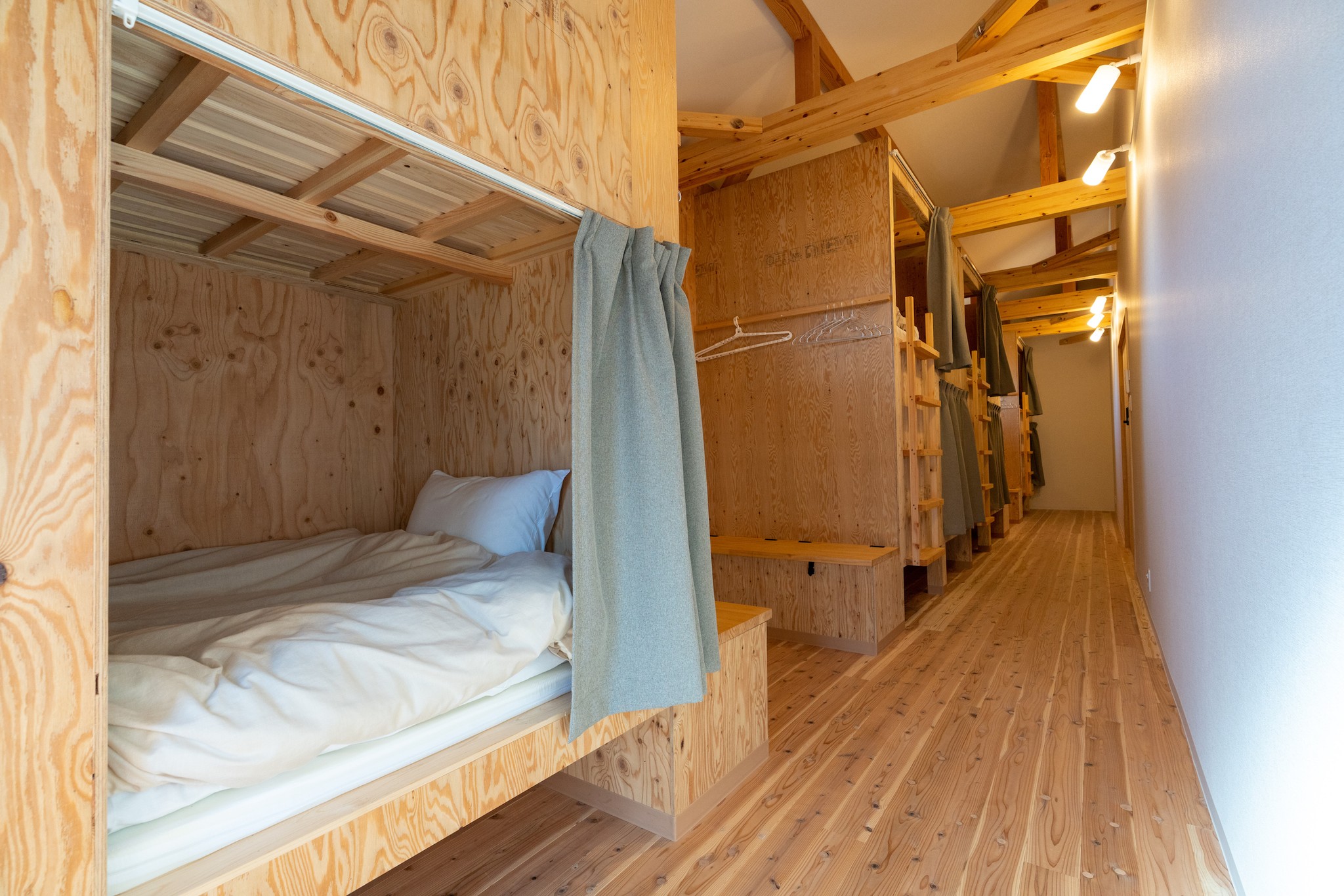 新築した宿泊棟は、1人旅でも不自由なく快適に旅してほしいという藤田さんの思いが具現化されています。ドミトリーのイメージを一新する、開放感たっぷりの空間が清々しい! 天井が高く、ベッドもセミダブル幅なので、2段ベッドとは思えないほどゆとりある居住スペースです。天板がベンチを兼ねた個人ロッカーもあり、Wi-Fiも完備。木がふんだんに使われているため、ほっと落ち着けます。