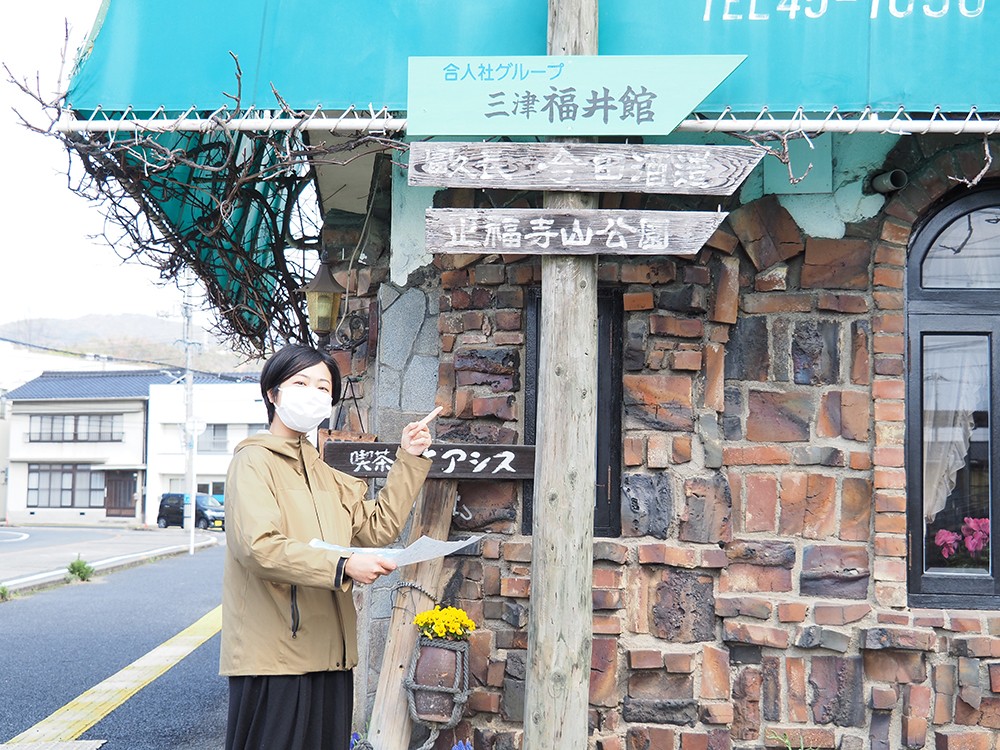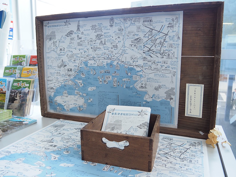 中に入ってみると、スタッフの方が。「きょうはどうしたん」と村上さんをよく知っているようです。「きょうはマップを見ながら安芸津を巡っているんです」と話すと、「このマップすごいよね、こんな細かく、よう書くよ~。最近、うちには外から来る女性のお客さんもいて、『近くにこんな場所があるんですね』って言ってマップを持って帰ってるよ」と嬉しい話が聞けました。