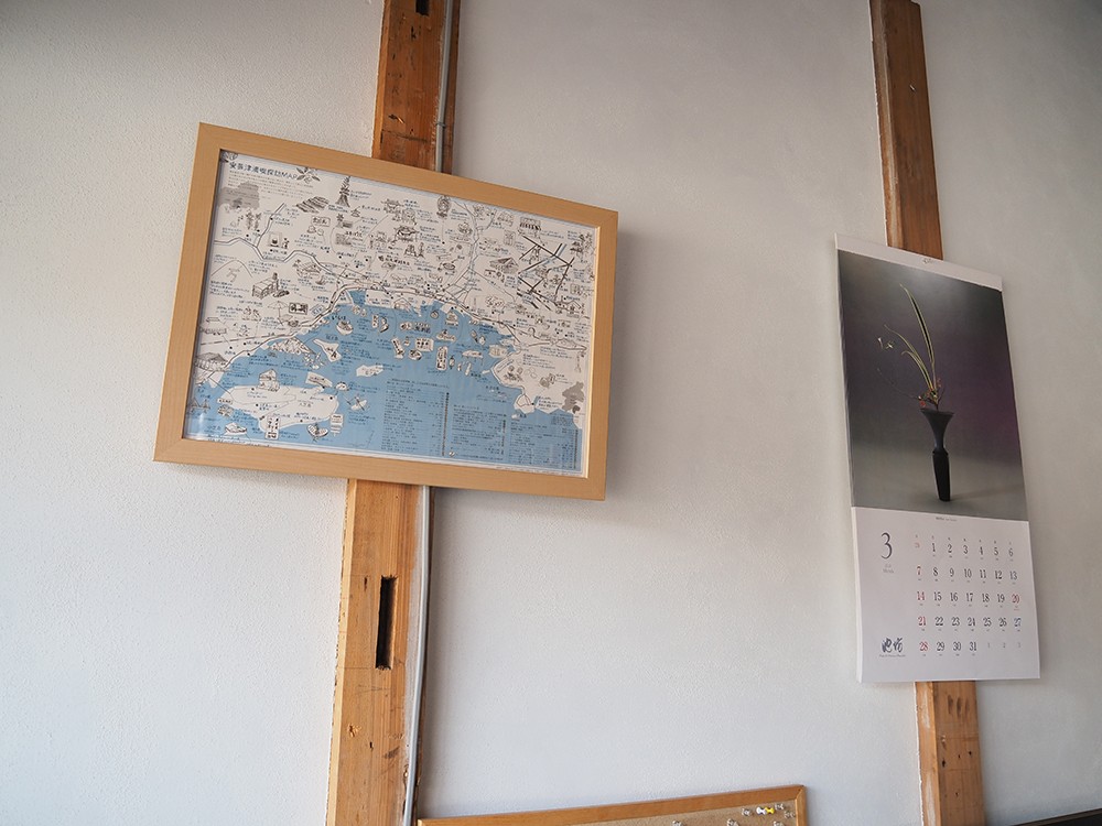 続いて、直火式ロースターで煎る自家焙煎コーヒーが人気の「安芸津歳實コーヒー」へ。この日は定休日でしたが、店内を覗かせてもらうと、なんと、マップが壁に飾ってあるではないですか!