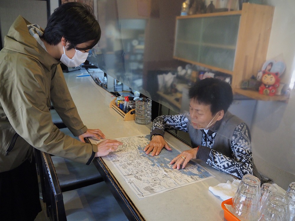 どこに行ってもその場でマップを広げると、安芸津トークに花が咲きます。