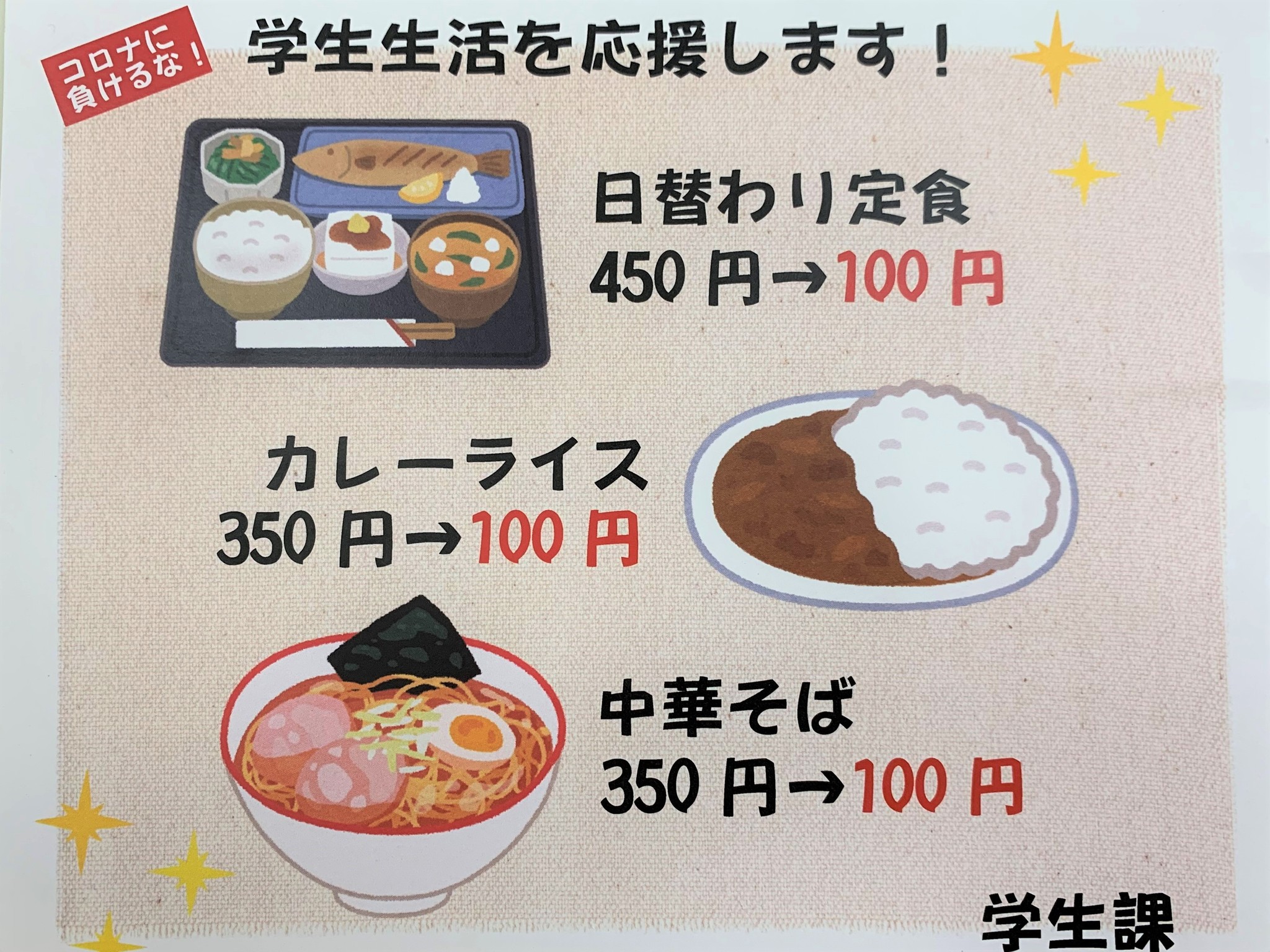100円で食べられるのは、通常350円のカレーライスにラーメン、通常450円の日替わり定食のあわせて3メニューで、差額は大学が負担します。実施期間は、前期の授業が終わる7月までを予定しています。