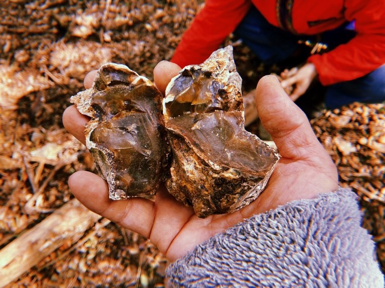 さらに進むと、近くに洞窟らしきところを見つけた。中に人が入れる大きさではなかったが、小さな穴が空いていたそうだ。穴の近くに転がっていた石を割って見ると、黄色い岩質が出てきた。その石はメノウだった。