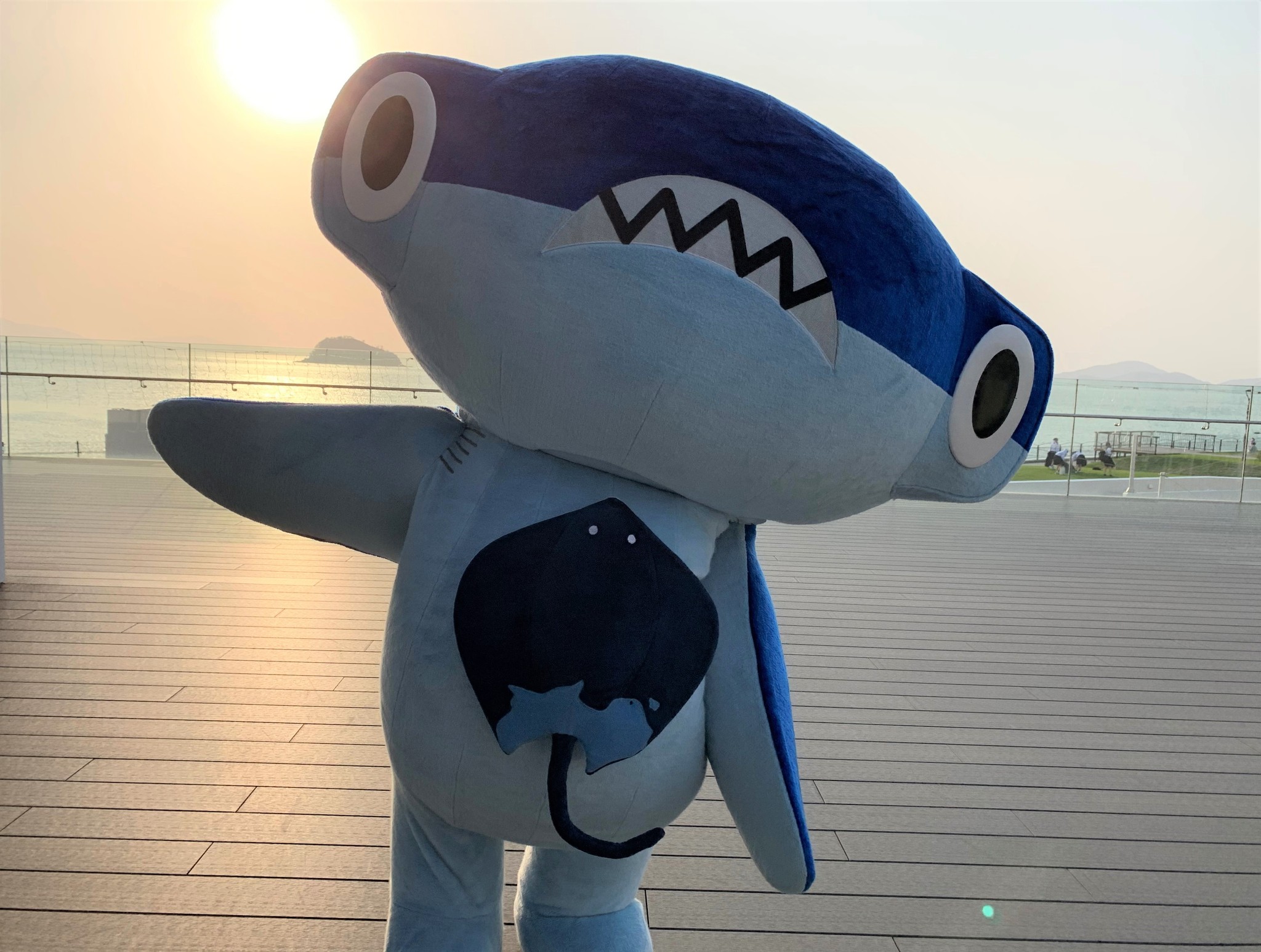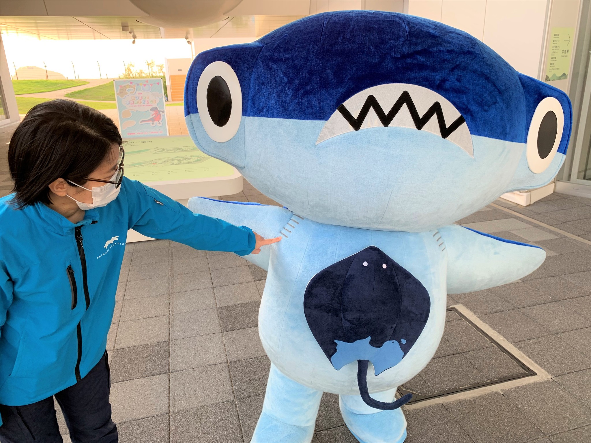 唯一、しゅこくんならではの部分が、エイくんと仲良くなって友達になったこと。本来であればシュモクザメにとってアカエイは格好のエサであるはずですが……「仲良くなったので、エイくんは絶対に食べません(笑)」と片山さん。そのエイくんの体には、四国の地形が描かれているというお楽しみポイントも。