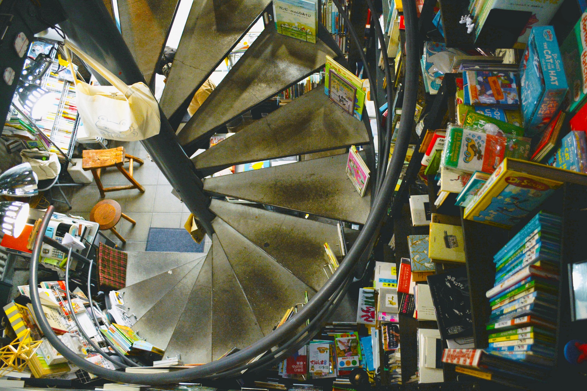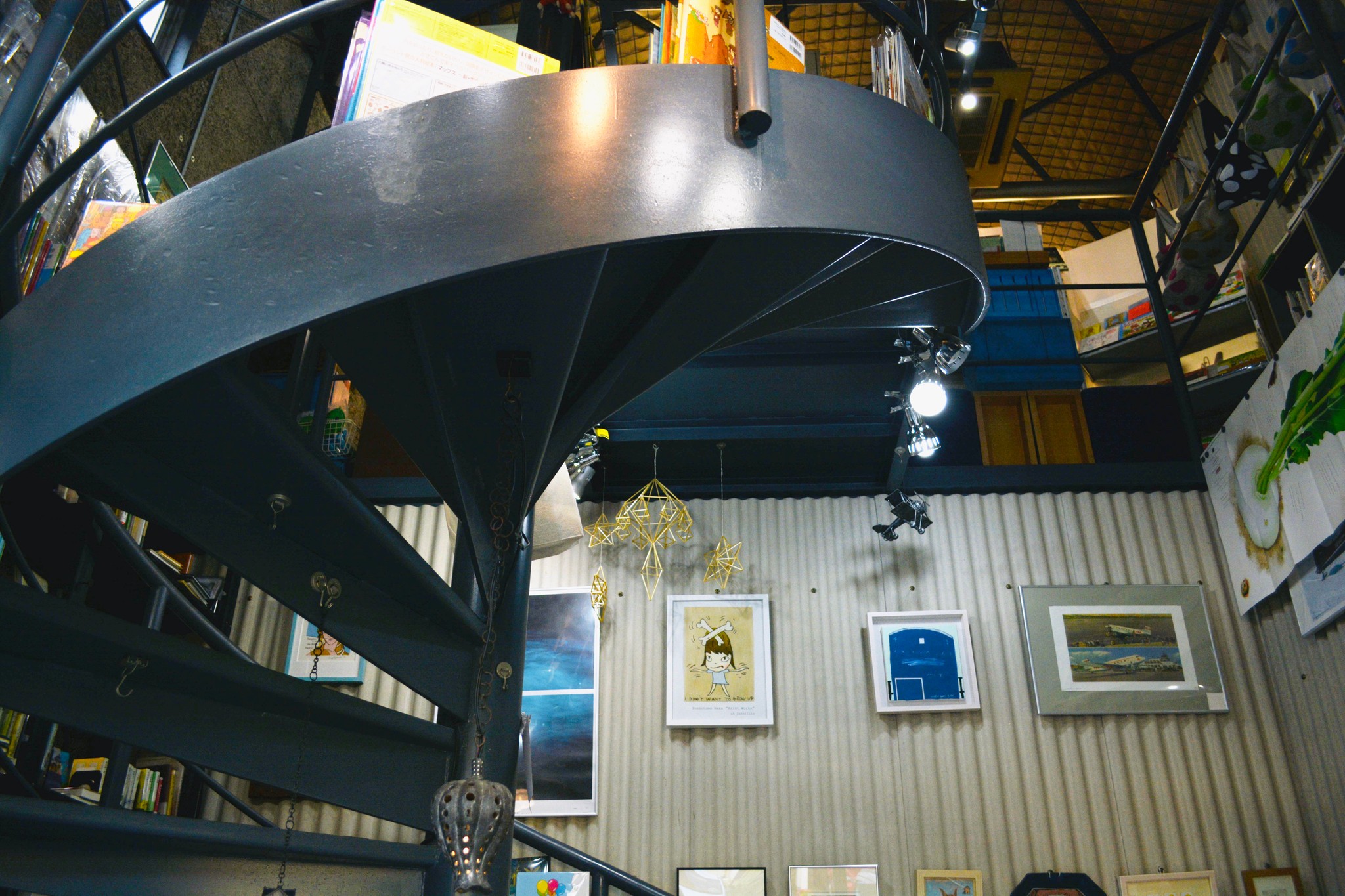 外観だけでなく、内観もユニーク。入り口の扉を開けるとすぐに螺旋階段が現れる。ぐるぐるっと階段をのぼる、その途中のあちこちにも本がレイアウトされていて、誘惑がいっぱい。階段を登り切ると、所狭しと本が並ぶ空間が広がる。「なんだか秘密基地に来たみたい!」そんな気持ちになってワクワクする。