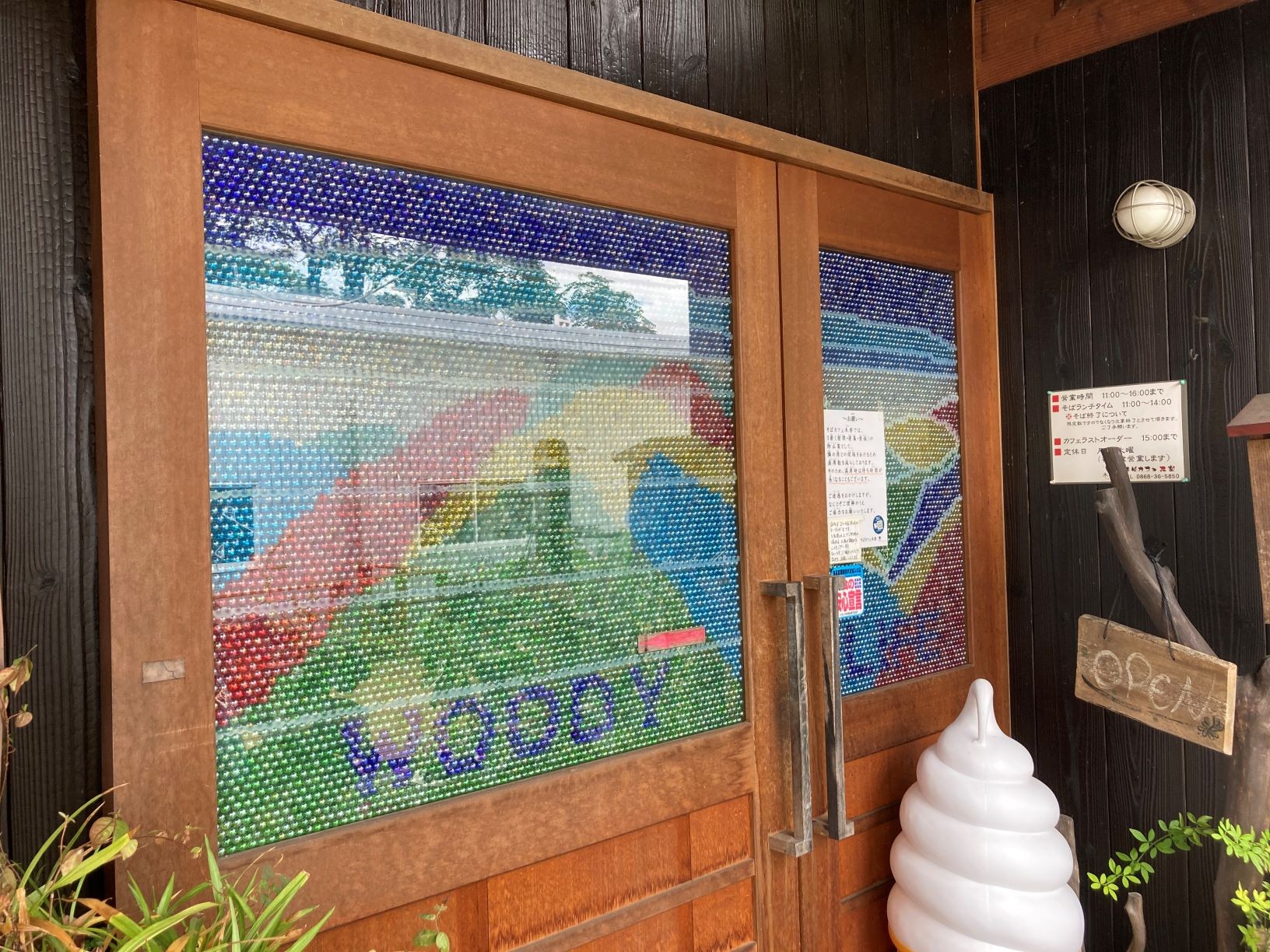 カフェは、2011年に作業場の横に木工作品の展示場として建てられた。そこに食事ができる空間も併設したいと考え、草苅さん自慢のそばを出すことにしたのがそばカフェのきっかけだった。1万2000個以上のビー玉を使って那岐山を描いたというお手製のガラス戸が出迎えてくれる。