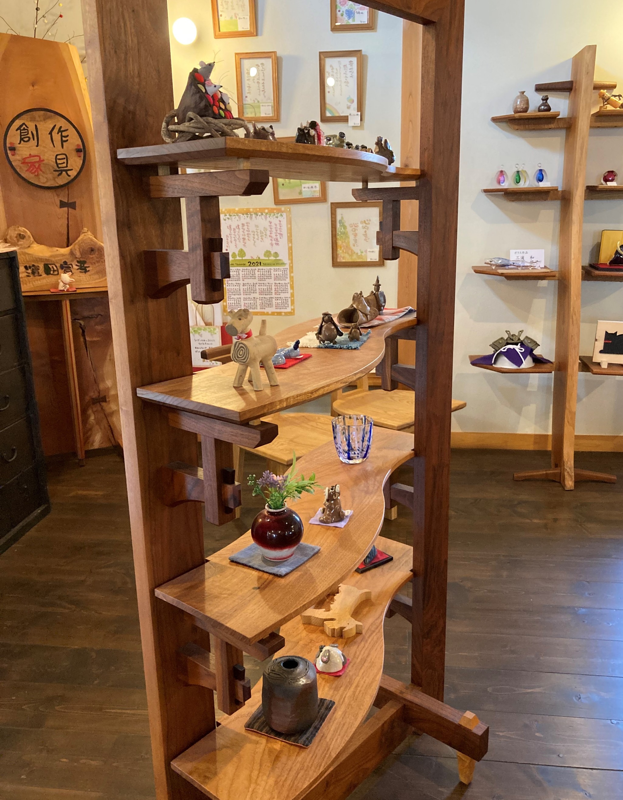 店内の机や椅子はもちろん、店内に設えられているモダンなタンスや両面から使える棚、特許を取った木皿などは全て草苅さんの作品で、オリジナリティー溢れるオンリーワンが並んでいる。