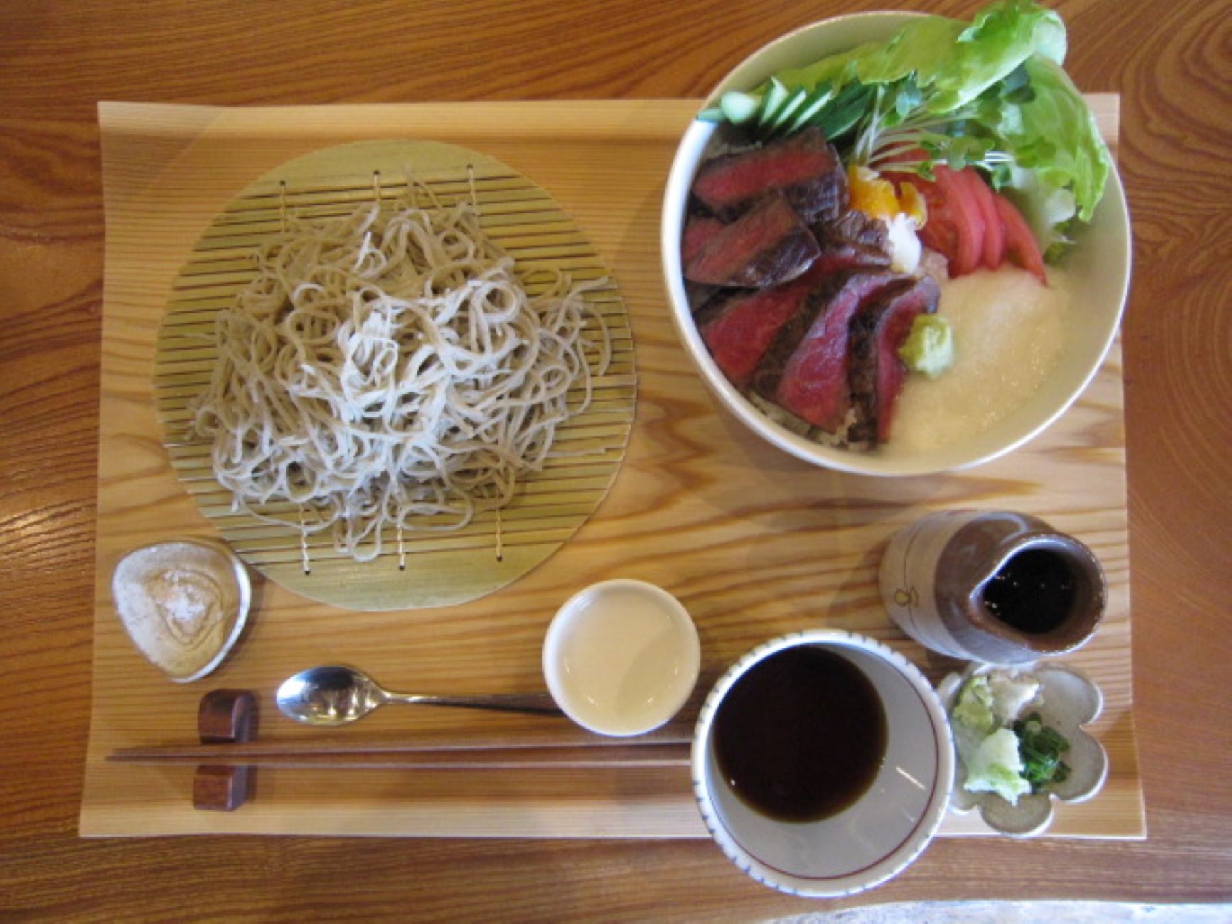 そばカフェの一番人気は木楽セット。奈義ビーフ丼と熟成ざるそばのコラボは、美味しさ間違いなしの組み合わせだ。