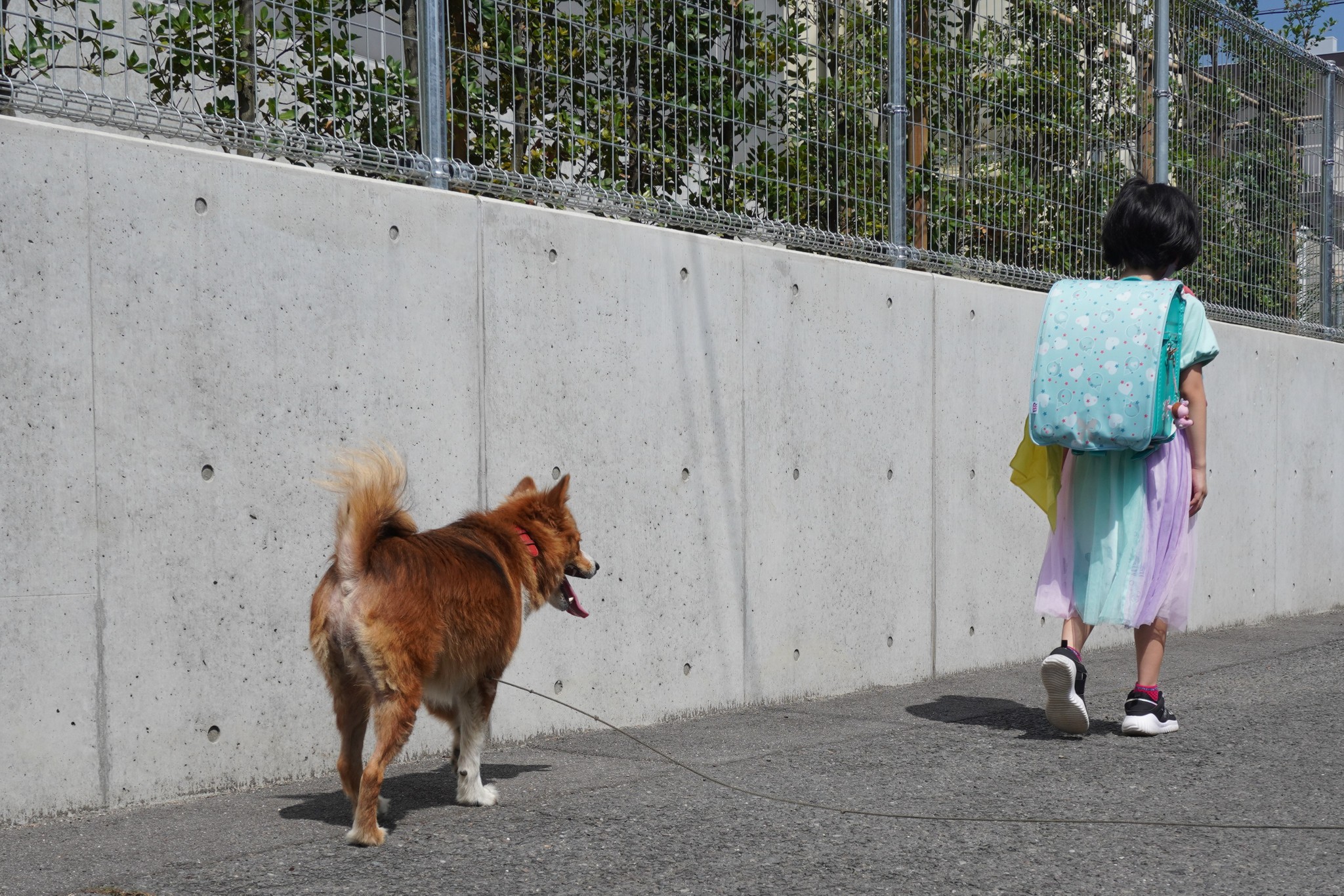 家にきて、半年で慣れてきた様子だったので散歩を始めました。その時から小学生の登校時間と重なっていたので、自然と登校を見守るようになりました。家の前は、登校班の集合場所になっているので、いくつかの班を見送って、最後に50メートルくらい進み、最後の班を見送って自分の家に帰っています。登校を見守って1年半くらいになりますね。