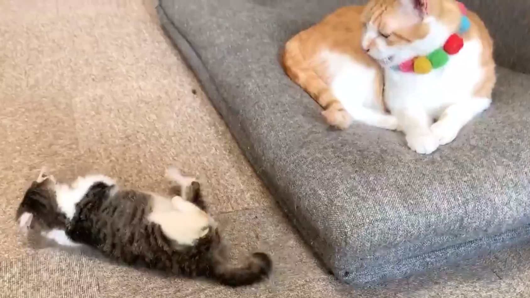 2匹間では、はじめての行動です。むぎくんは優しく保育リーダーみたいな存在で、預かったねこにいつも優しくしてくれる。この時は、むぎくんはなめてかまってあげているところです。ソフィーちゃんは、まだ小さいので、いすをつかむことが出来ず、落ちてしまったんだと思います。