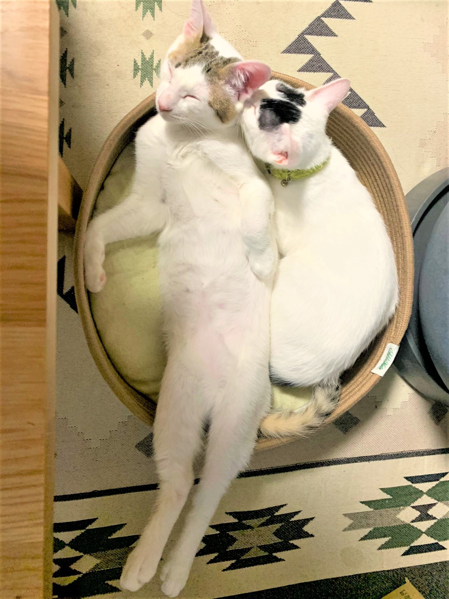 子猫というには大きいなと、1匹は模様がトリッキーだなと思いました。1匹だけ飼うつもりでしたが、片方だけもらってしまうと、もう1匹は、(誰かに)貰われないのではないかと思ったのと、2匹がすごく仲が良くて、引き離すのは忍びないなと思って、2匹貰うことにしました。