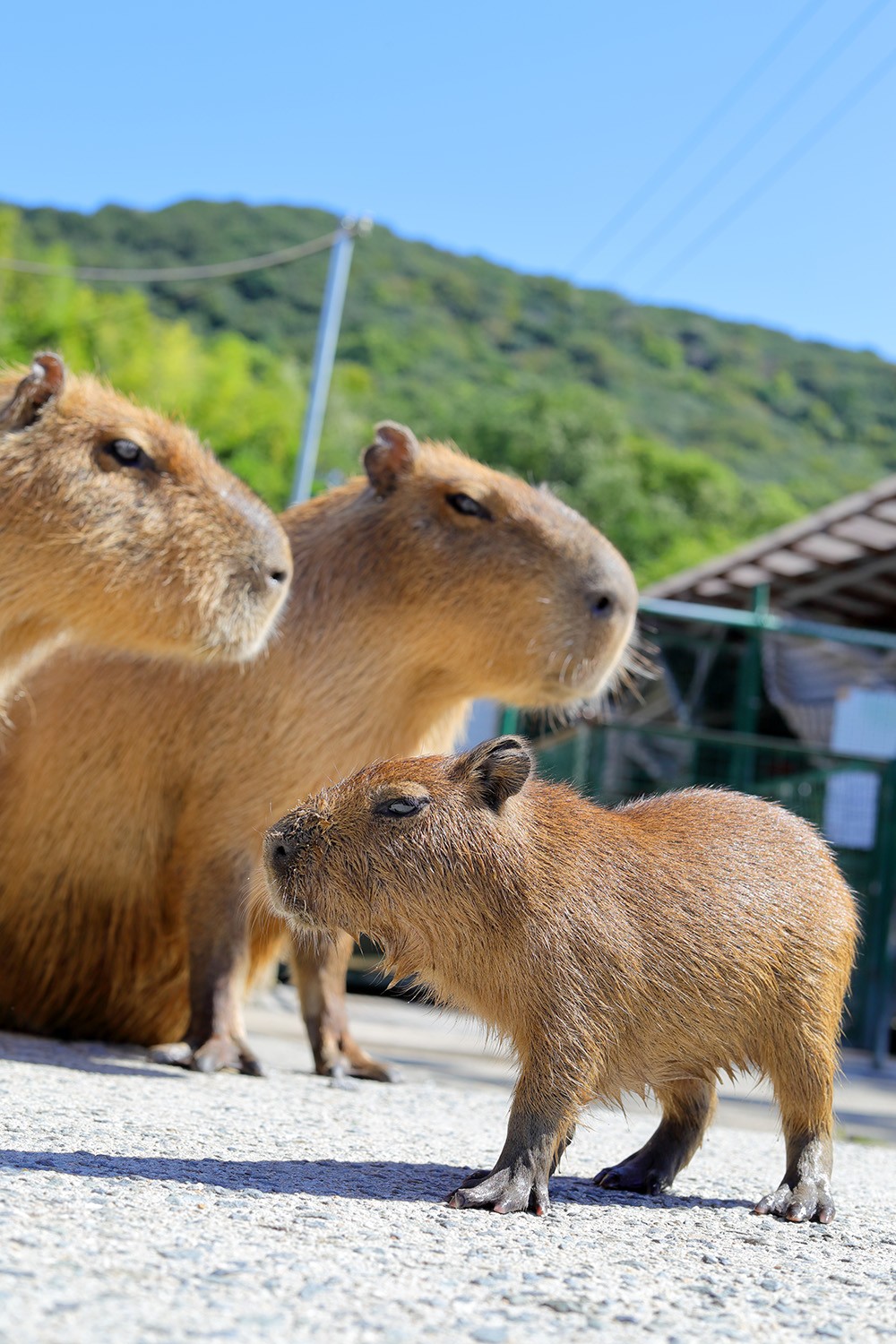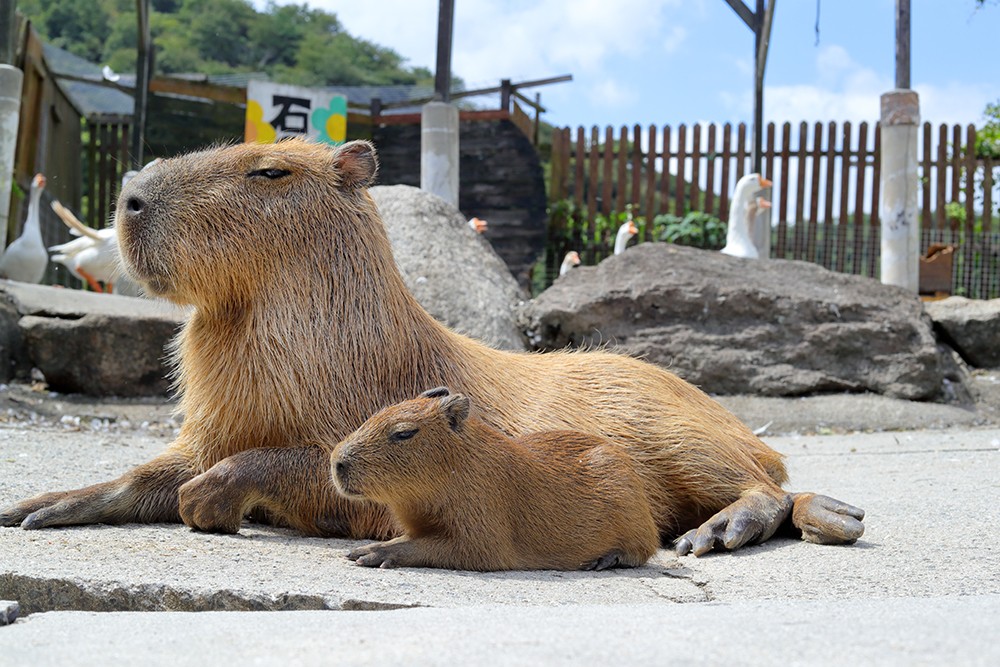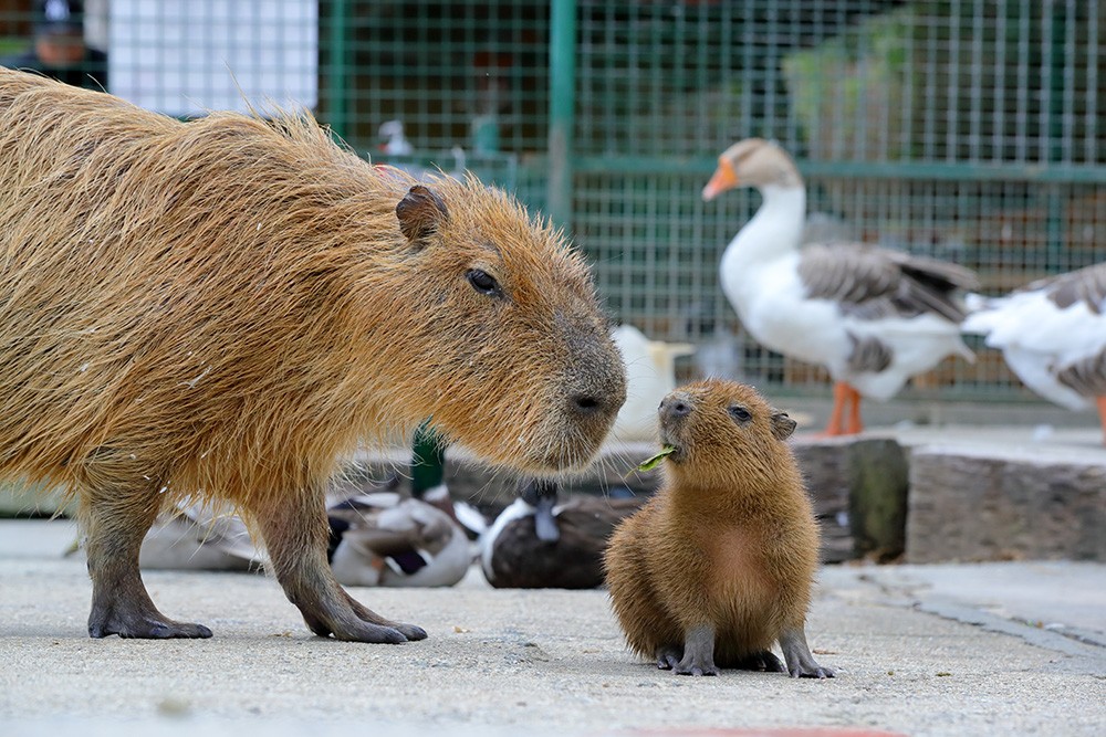 カピバラは、まったりとした雰囲気を持っていますが、意外に警戒心が強い生き物。母カピバラのとくちゃんは、人が近寄ると警戒し”おちびちゃん”を守っていますが、既に吉田さんの存在を認めているようです。