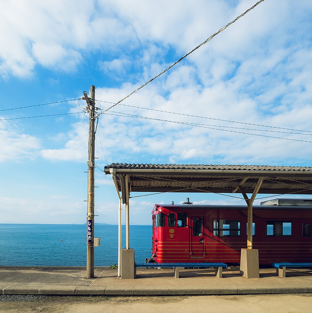 車両の色はオレンジと赤。夕日をイメージしたカラーリングになっています。また、無人駅かつ夕日で有名な「下灘駅」での停車時間を楽しめるのも魅力の1つです。