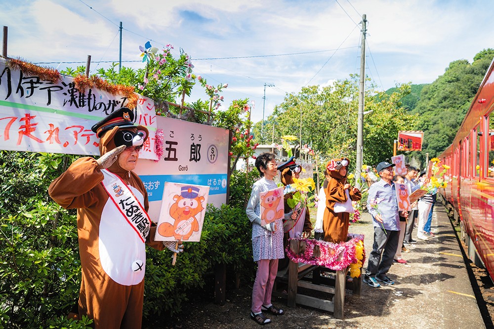 山田さんはじめ、乗車する人たちの“心温まる思い出”として挙げられるのが、走行する伊予灘ものがたりに向かって手を振る人たちの存在です。「ようこそ!」と描かれた手作りの看板を持っていたり、お揃いのシャツを着ていたり、「たぬき駅長」という着ぐるみを着た強者もいるほどです。