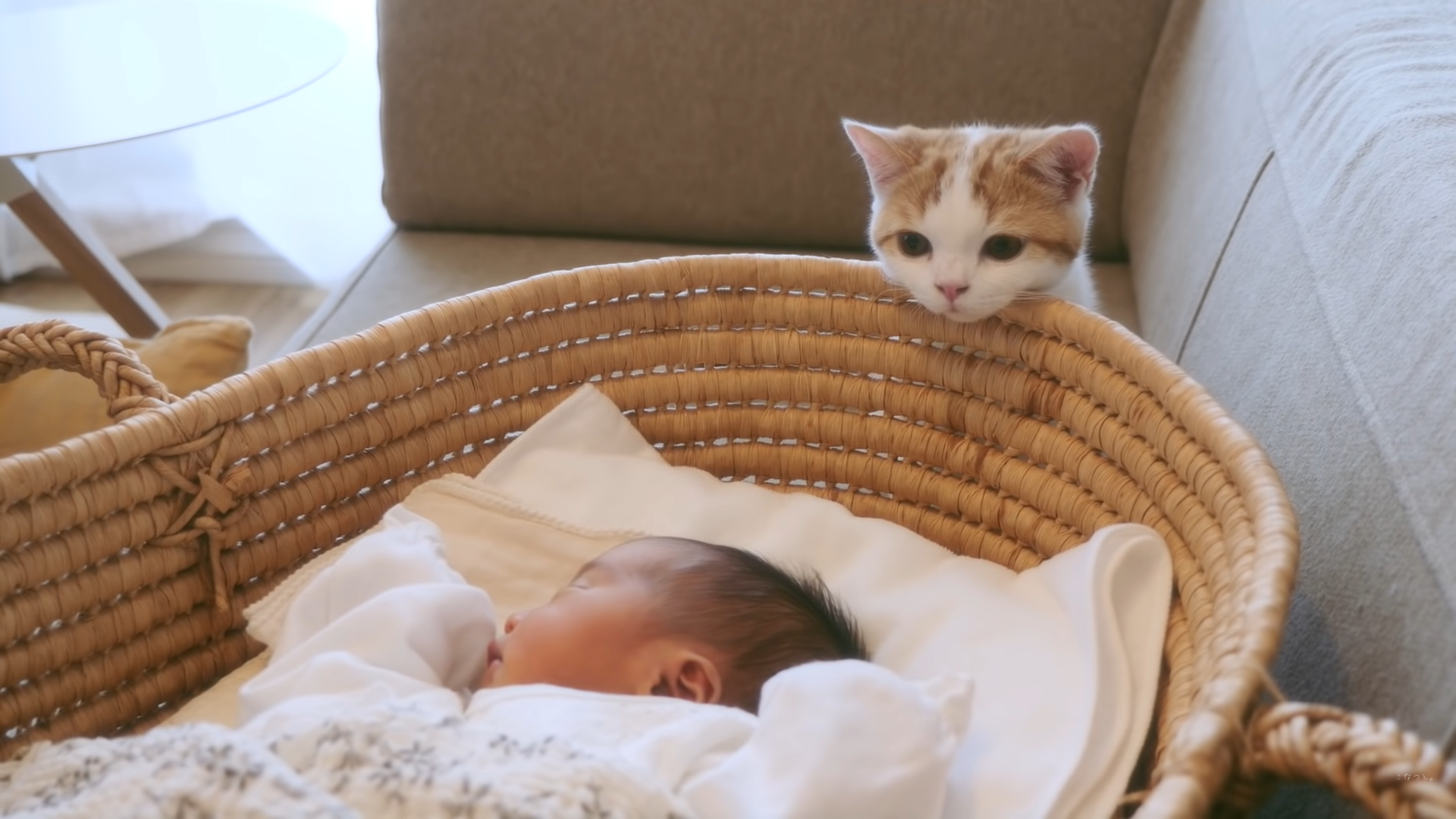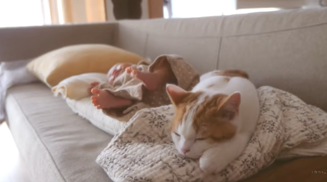 きっと「大事にすべき存在、守るべき存在」だと思ってくれていると思います。こなつは、クッションや毛布などフカフカしたものが好きで、隙あらば、赤ちゃんが使っている小さな布団の上で寝ようとするのですが、赤ちゃんが寝ているときは、気を遣っているのか必ず真ん中を赤ちゃんに譲って自分は端っこで一緒に寝ています。フミフミするときも、赤ちゃんを踏まないように恐る恐る手を伸ばして、身体に当たっていないか確かめながらしているので、そういった様子から赤ちゃんのことを大事に思っているんだなと感じます。