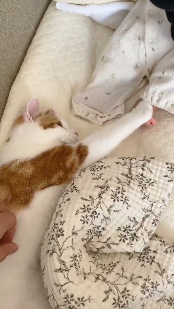 どんなに赤ちゃんに蹴られても絶対に離れようとしない猫の動画が、Twitterで注目を集めています。動画を見ると、猫はなかなか寝付けずに泣いている赤ちゃんを「大丈夫だよ」と落ち着かせるように、しっかりと手でつかまえ、お母さんに抱き上げられるまでの30秒程度、ずっと赤ちゃんの足に抱きついています。お母さんが赤ちゃんを抱っこして猫から離れていく時は手で「待って」と引き止めるような行動をしています。