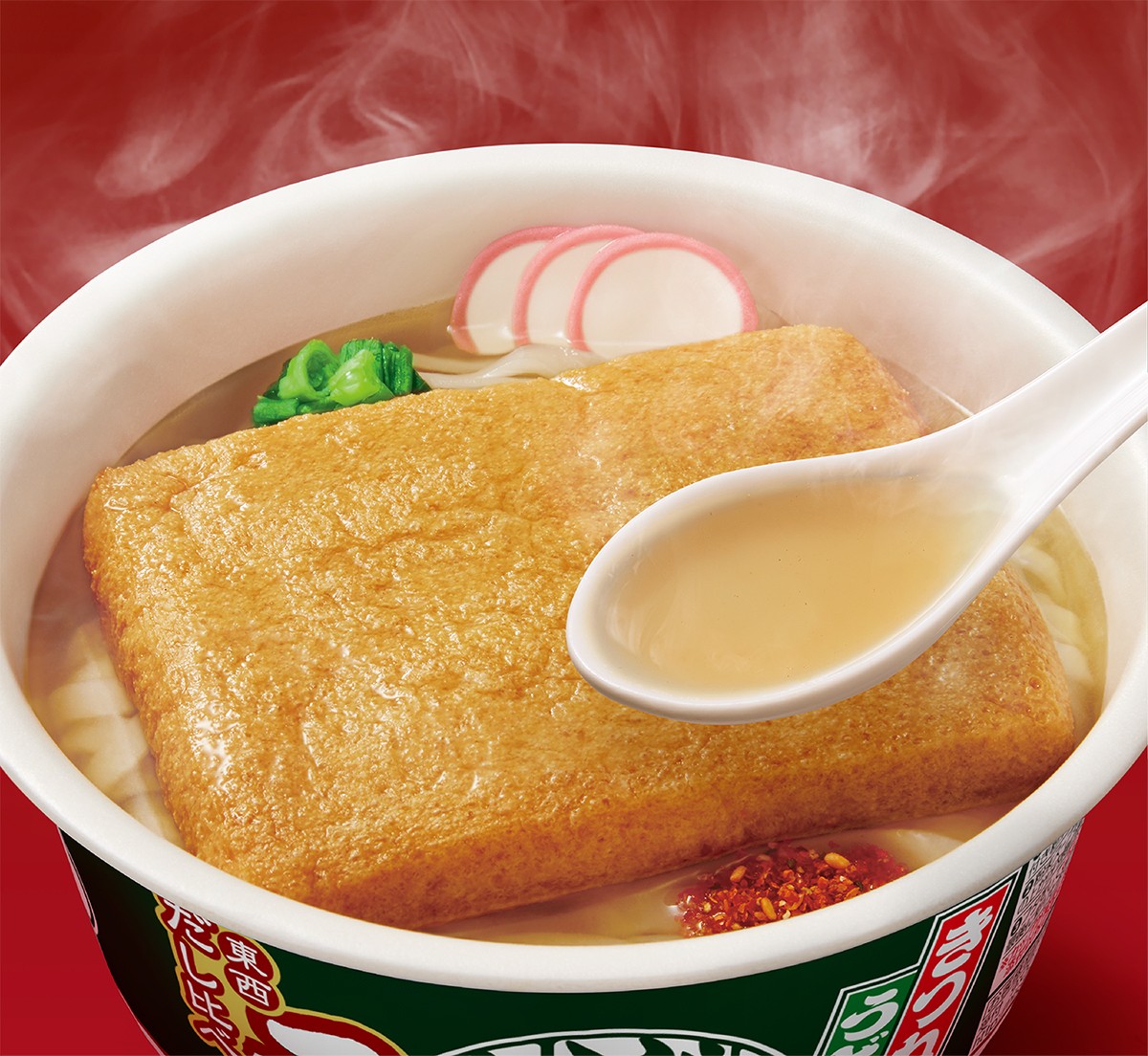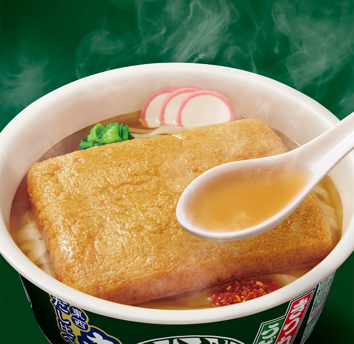 東のどん兵衛には、熟成された枯れ節の本鰹と宗田鰹を使用。コクと旨みを感じられる色の濃いつゆは、力強さが効いています。
