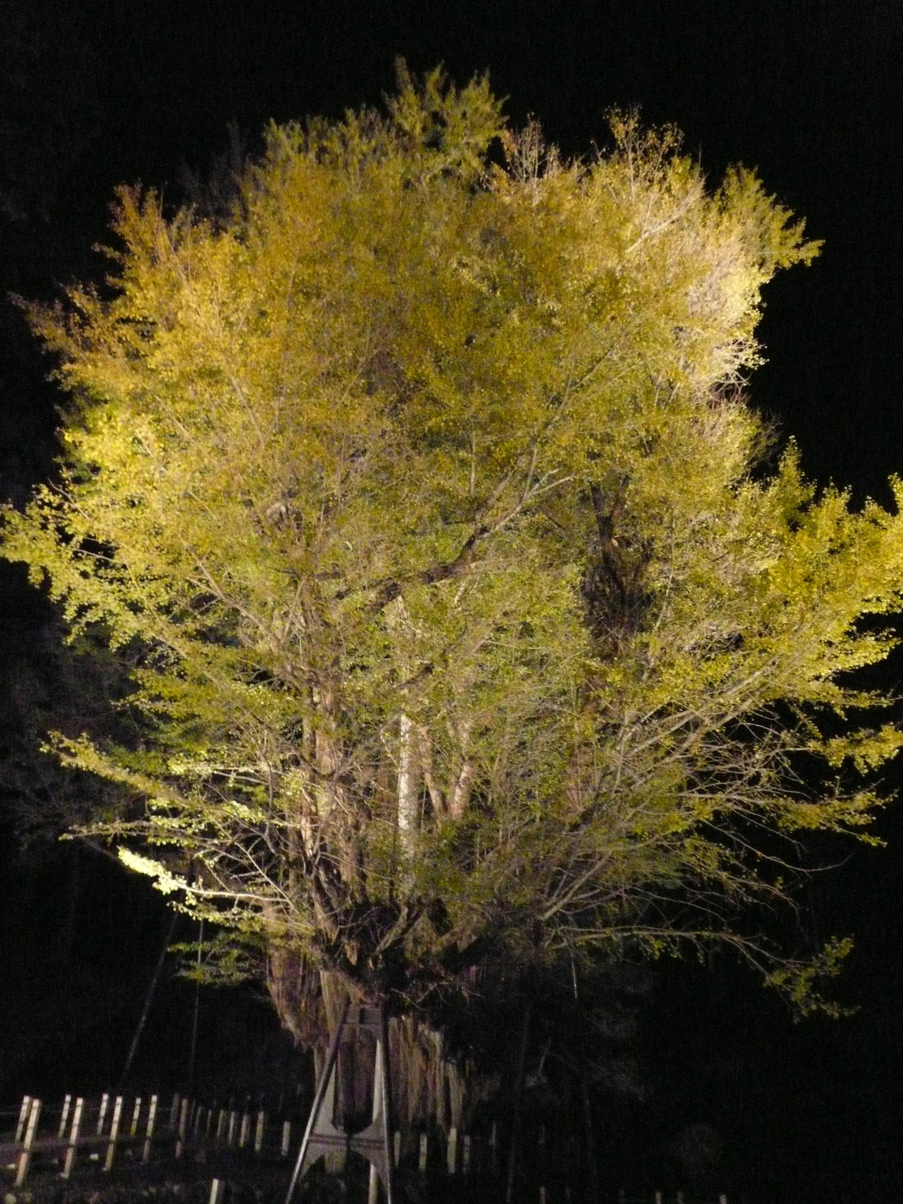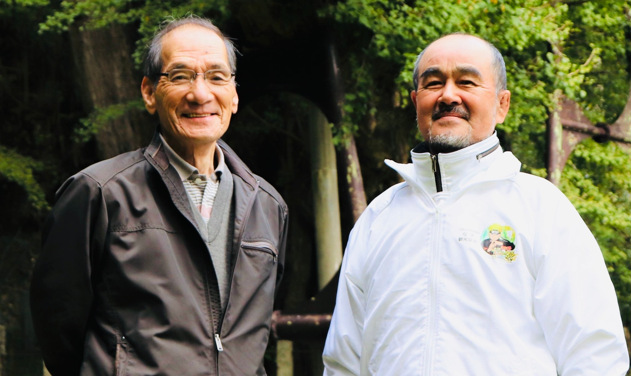 この「大イチョウ」は紅葉の見頃の時期、奈義町観光協会の協力でライトアップが行われる。その取り組みに関わっている、同協会会長の鷹取渡さんと、副会長の黒藪富吉さんに話を聞いた。
