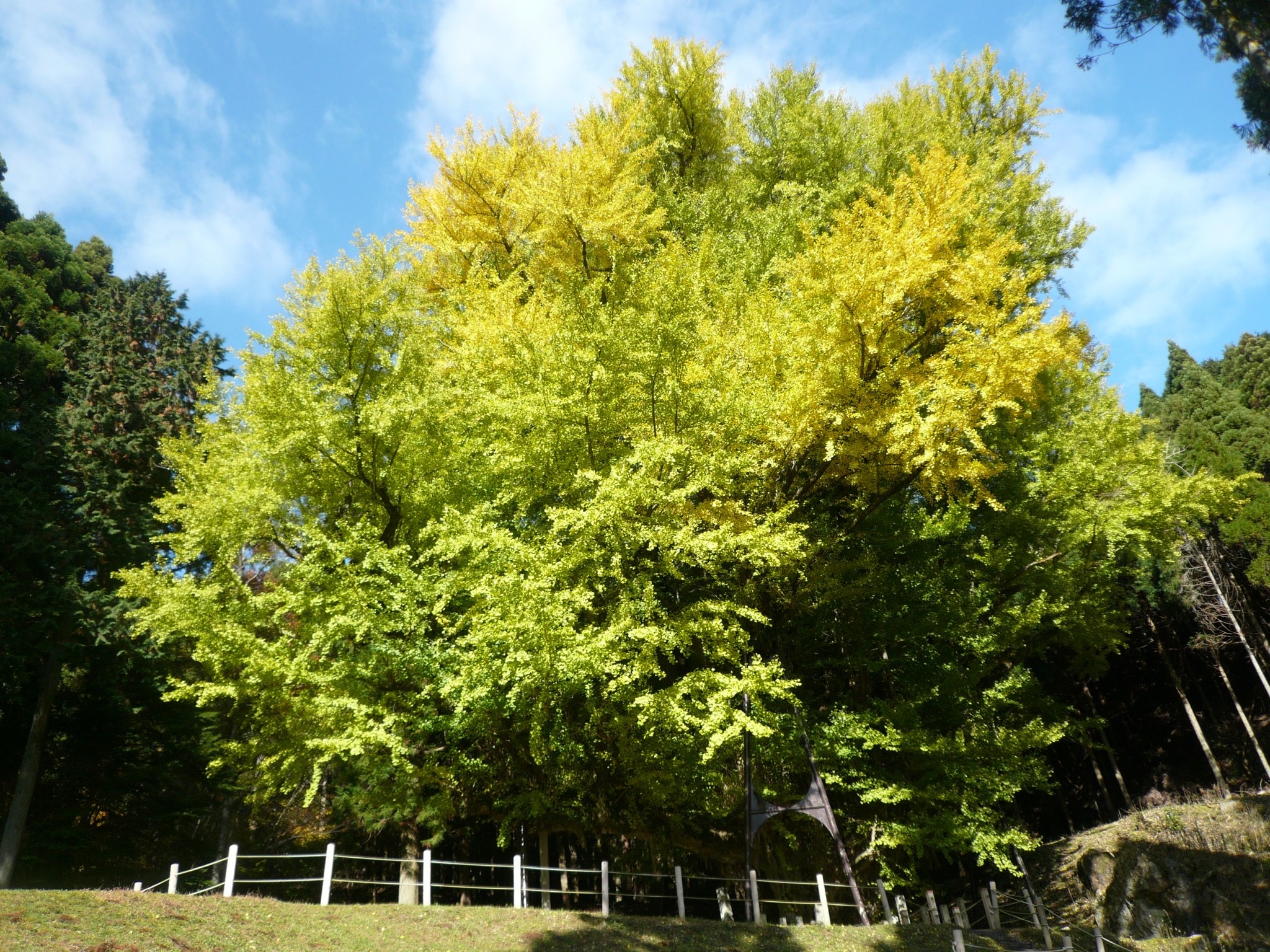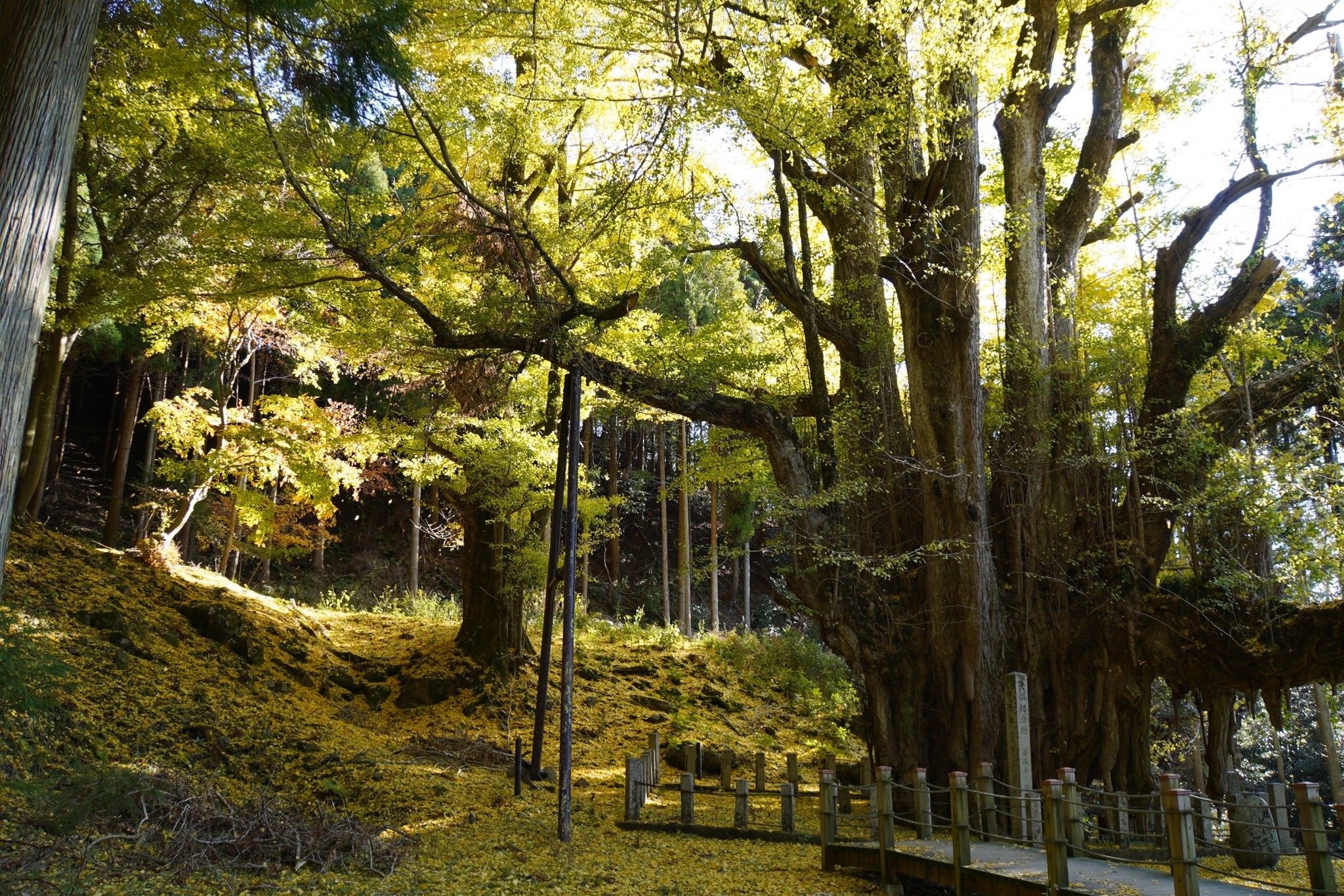 菩提寺の境内にそびえる大イチョウは、高さ約45m、目通り幹囲約13m。国定公園にも指定されている那岐山(標高1255m)の中腹600m辺りに位置する場所にある。