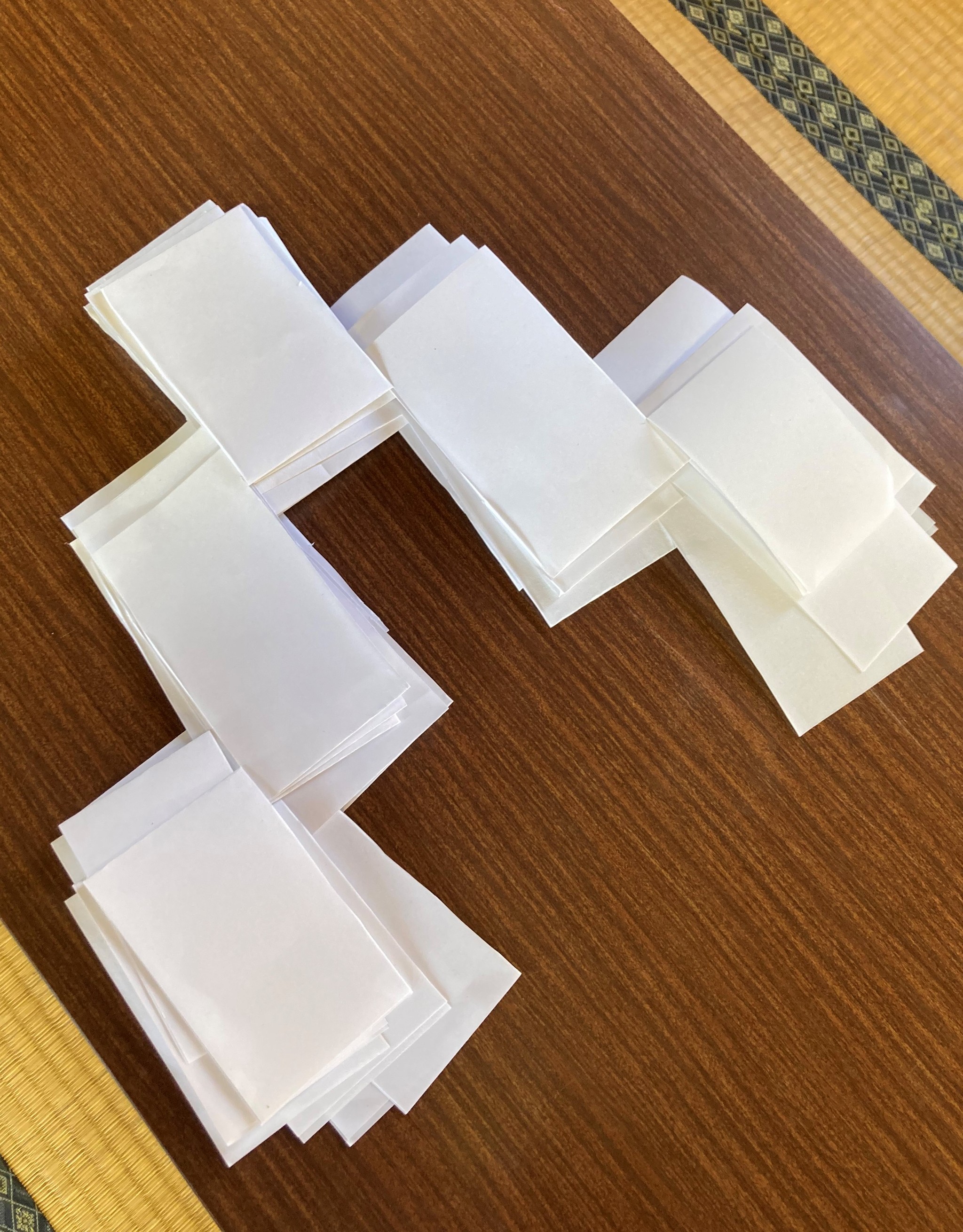 11月3日、行事で使う竹と幣(半紙を切り折りしたもの)の準備をするため、近くの公民館へ子どもたちが集まった。亥の子は小学生が主役で、高円山口地区は今年度小学1年生が3人入ったことで、合計8人になった。