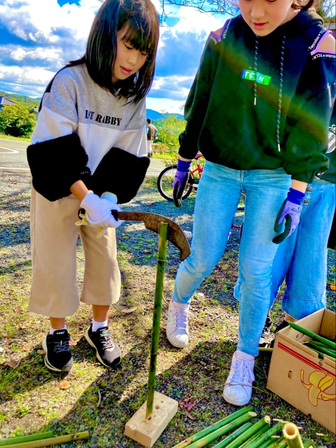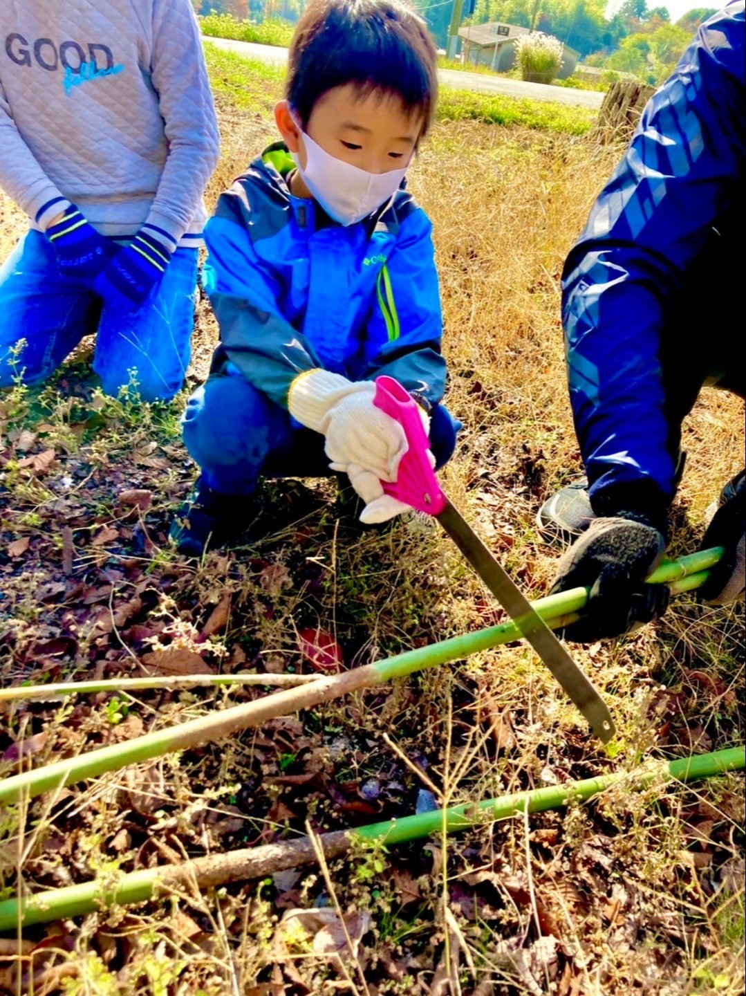 保護者や中学生が近くの竹林で竹を切ってくれたものを、更に細かく切り分けていく。のこぎりを使うのは初めてだったそうだが、「楽しい」と言いながら慎重に扱い、作業していた。