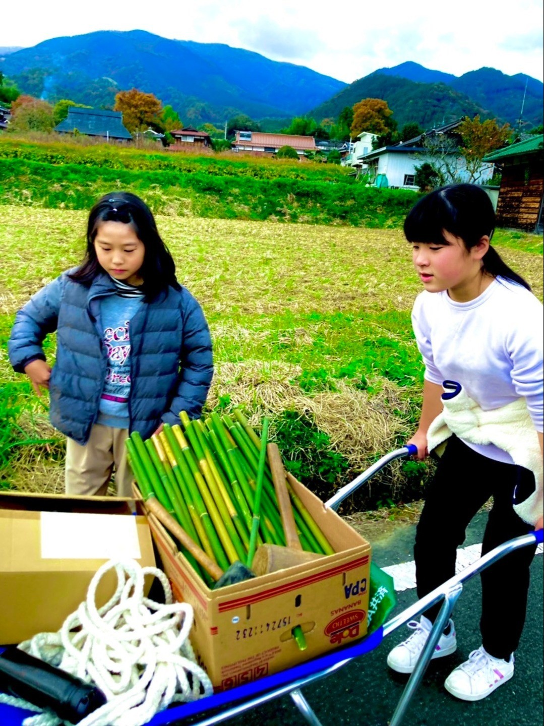 11月6日の当日。準備した竹などを積み込んで、家々を歩いて回っていく。移動に使うのは一輪車だ。