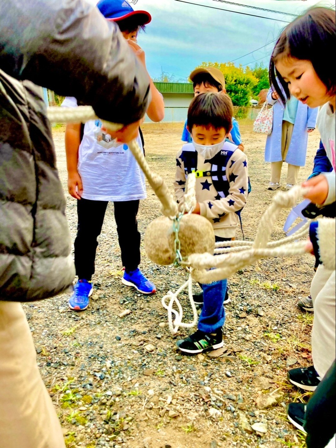 地区や地域によって違うが、高円山口地区の石に繋がれている紐は4本。つき手を交互に変え、8人で石をついていく。直径約30cmほどの石は小さく見えるが、大人が持っても少し重たい。子ども4人がかりで1回打つのも大変だ。