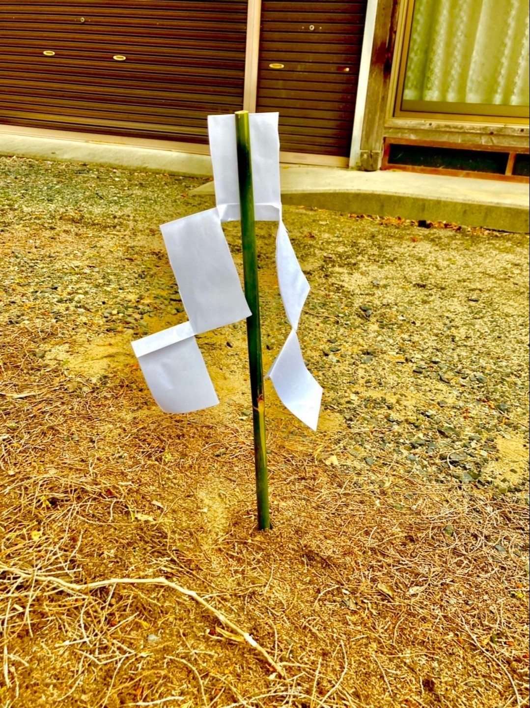 石をついたあとは、竹を地面にさして幣を挟んで出来上がり。一連の動作を繰り返し行う亥の子は半日かかる大仕事だ。
