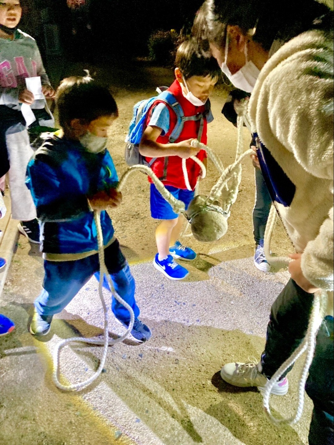 午後3時半に出発した亥の子は、日が落ちて辺りが暗くなっても続いていく。親も付き添い、暗がりで足元が見えにくい所をライトで照らしたり、子どもたちが道から落ちないようにサポートしながら歩いた。この頃謙真君は弱音を吐いたりせず、着々と家々を回っていた。