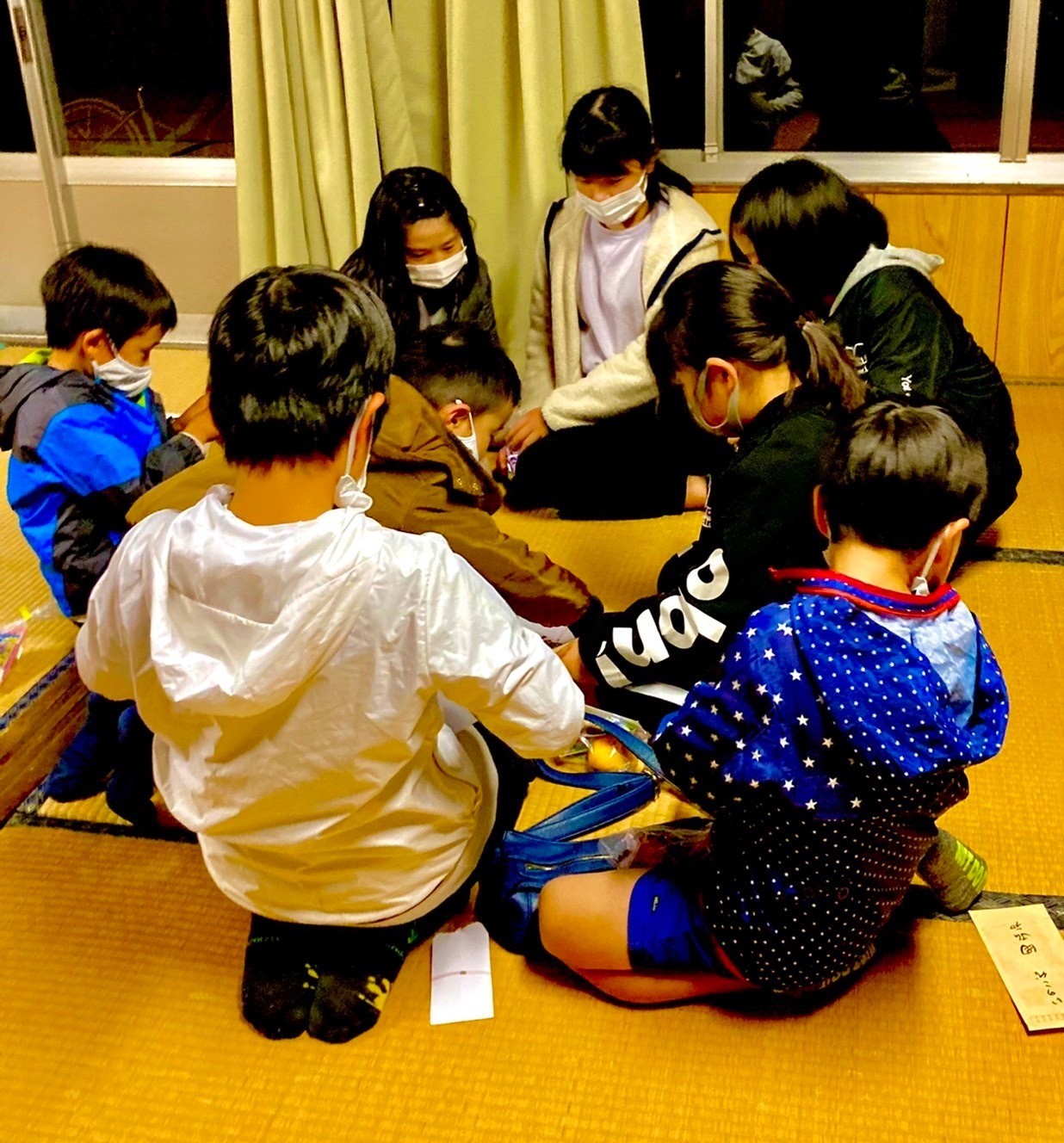 午後7時、約40軒の家を回りきると行事は終了。最後は公民館に集まり、石をついた後に各家庭からもらったお菓子を食べながらくつろいだ。寒い中暗い道を歩き、疲れていたはずの子どもたちはすっかり元気を取り戻し、賑やかに過ごしていた。