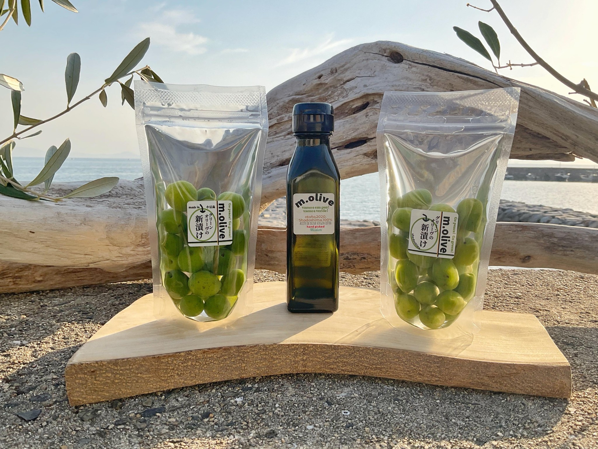 ふたりは、最初からオリーブ生産者になるために小豆島に来たわけではありませんでした。たまたま房江さんの知り合いが小豆島にいたことから島に来ることになり、最初はオリーブ農家でアルバイトなどをしていました。そこで収穫も新漬け加工も体験するうちに独立。そして、2020年から「森村農園 m.olive(モリーブ)」として新規就農します。島内3か所に成木のオリーブ畑を借り、オリーブ果実の出荷とオリーブオイルの販売を始めました。独立2年目の2021年は、2020年の3倍近い収穫量で「新漬けオリーブ」の加工も開始しました。