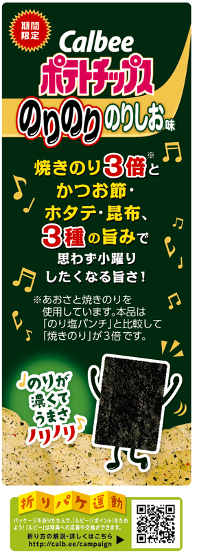 カルビーが、11月29日からコンビニ限定で発売しているのが、定番・のりしおシリーズの新商品『ポテトチップス のりのりのりしお味』です。東北・関東・中部地方限定で発売している『のり塩パンチ』に比べて、焼きのりの量を3倍にしているのが特徴です。