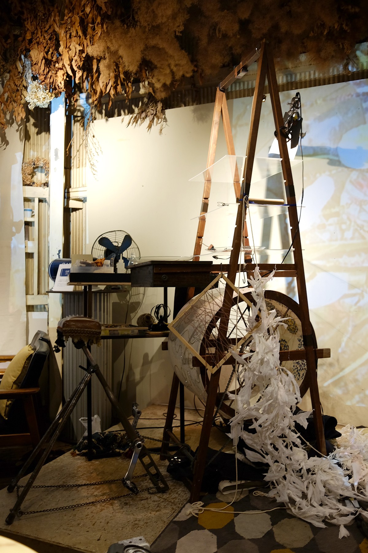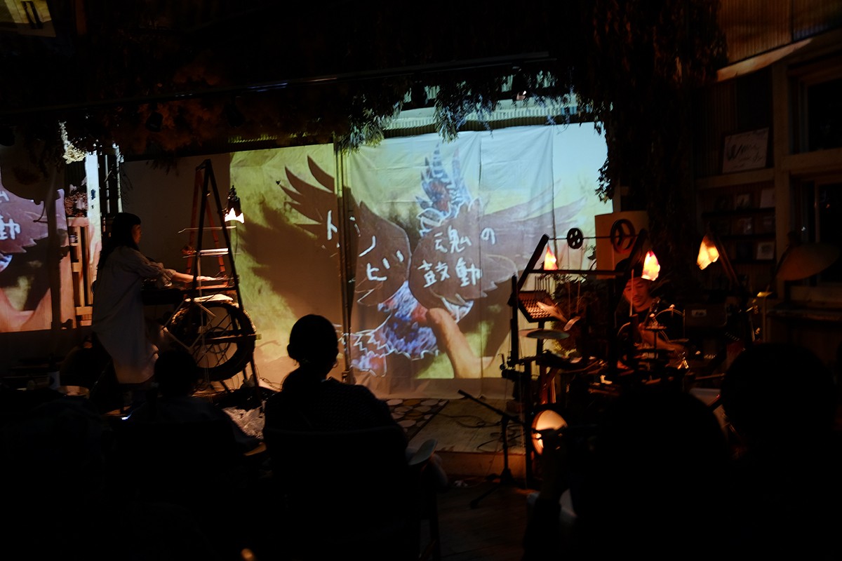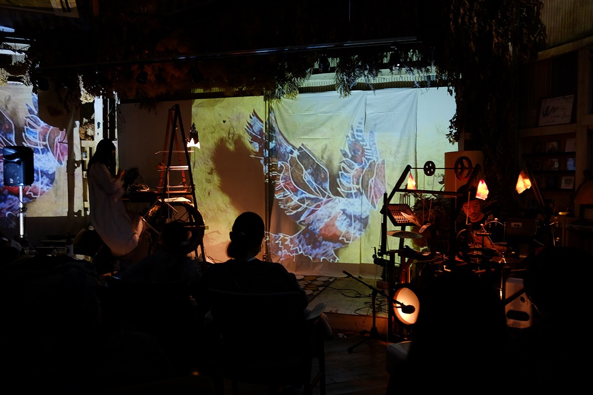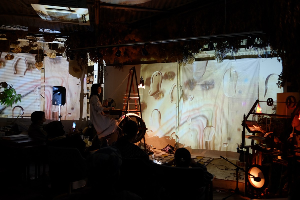 その様子は投影機で壁に映され、「SHIBAKI」が奏でる不思議な響きの音楽とマッチして、唯一無二の世界観を生み出しています。