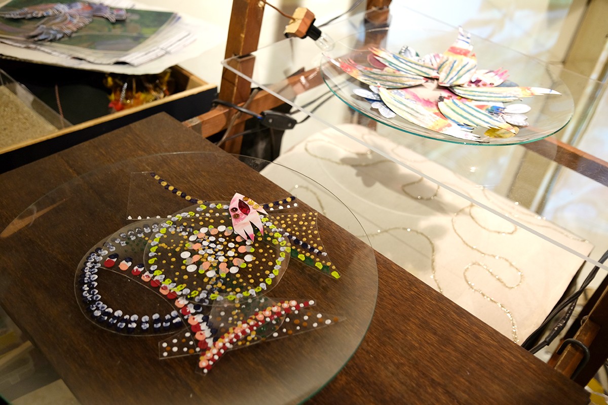 「TA-CO」はアクリル板が4枚重ねられ、絵美さんが音楽に合わせてアクリル板に様々なアイテムを置いていきます。刺繍やオリーブの葉、貝や写真など、手作りの素材が絵美さんの手によって、新たな佇まいを生み出していきます。