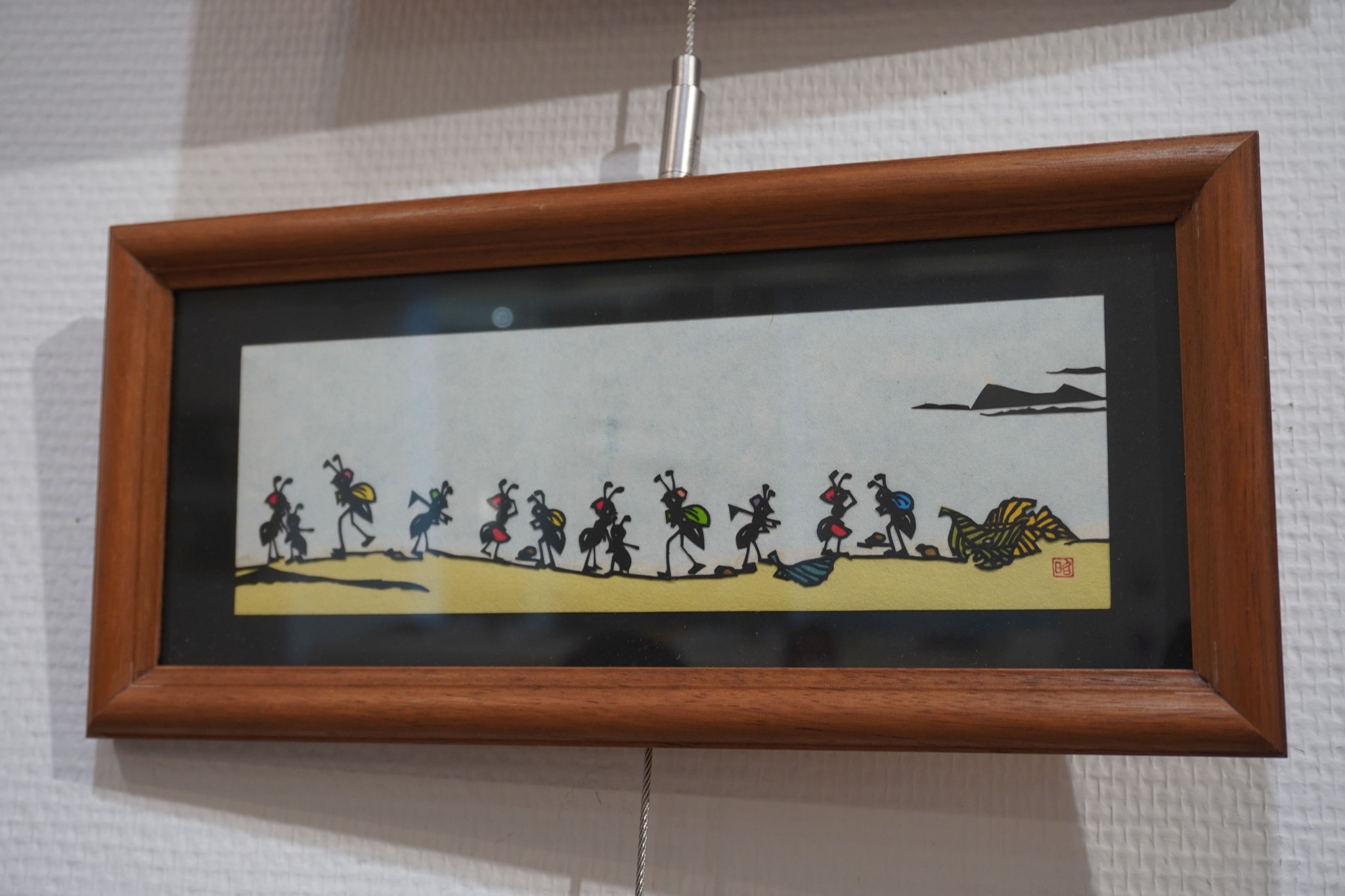 その後、大学を卒業し高校の教師になった豊岡さんですが、教師になってからも切り絵はずっと続けていました。授業の中で、生徒に切り絵を教えていたこともあったそうです。その後定年退職し、他の人と一緒に切り絵をするようになりました。そして友人が友人を呼んでその輪がどんどん広がっていき、切り絵グループ「かみきり虫」が結成されたのです。