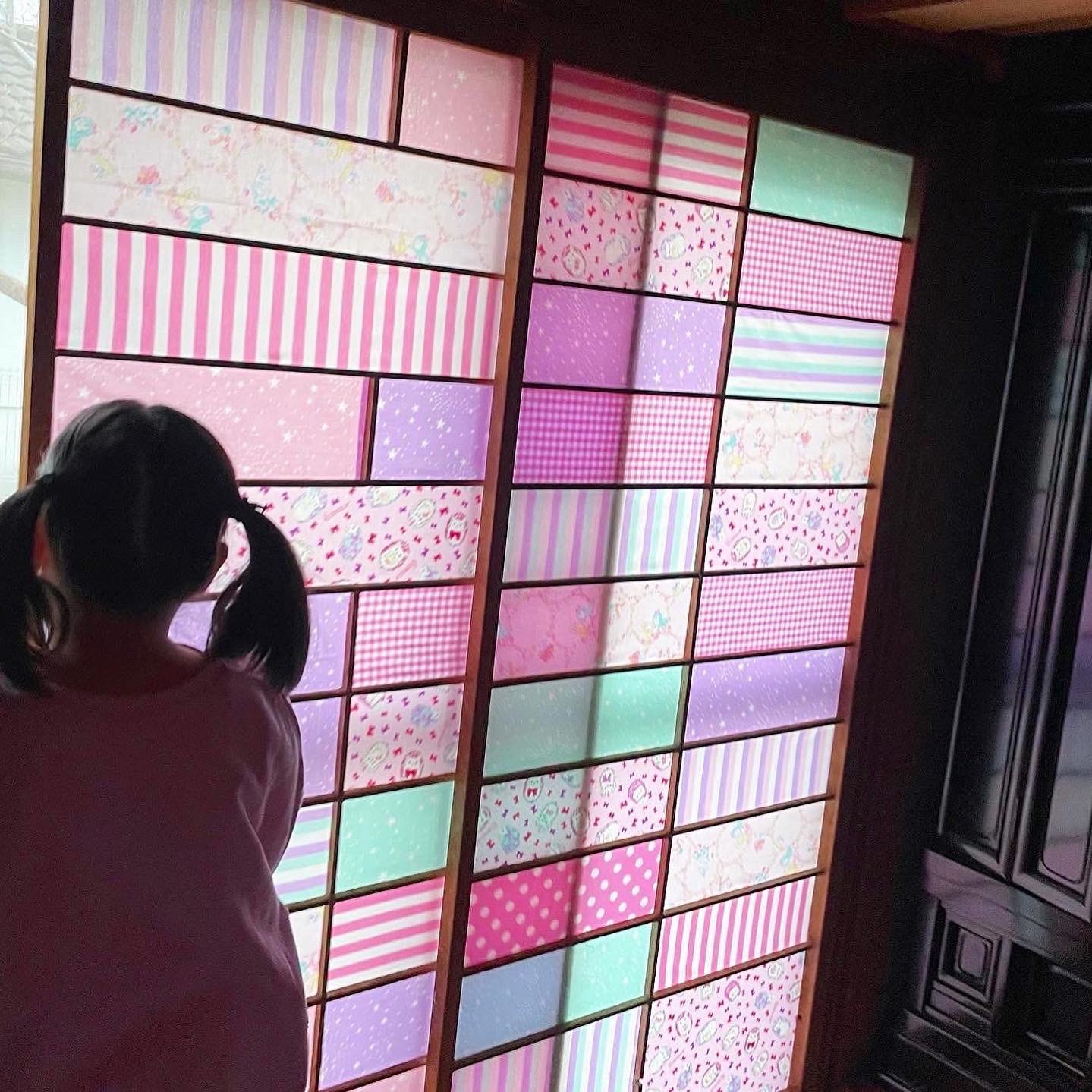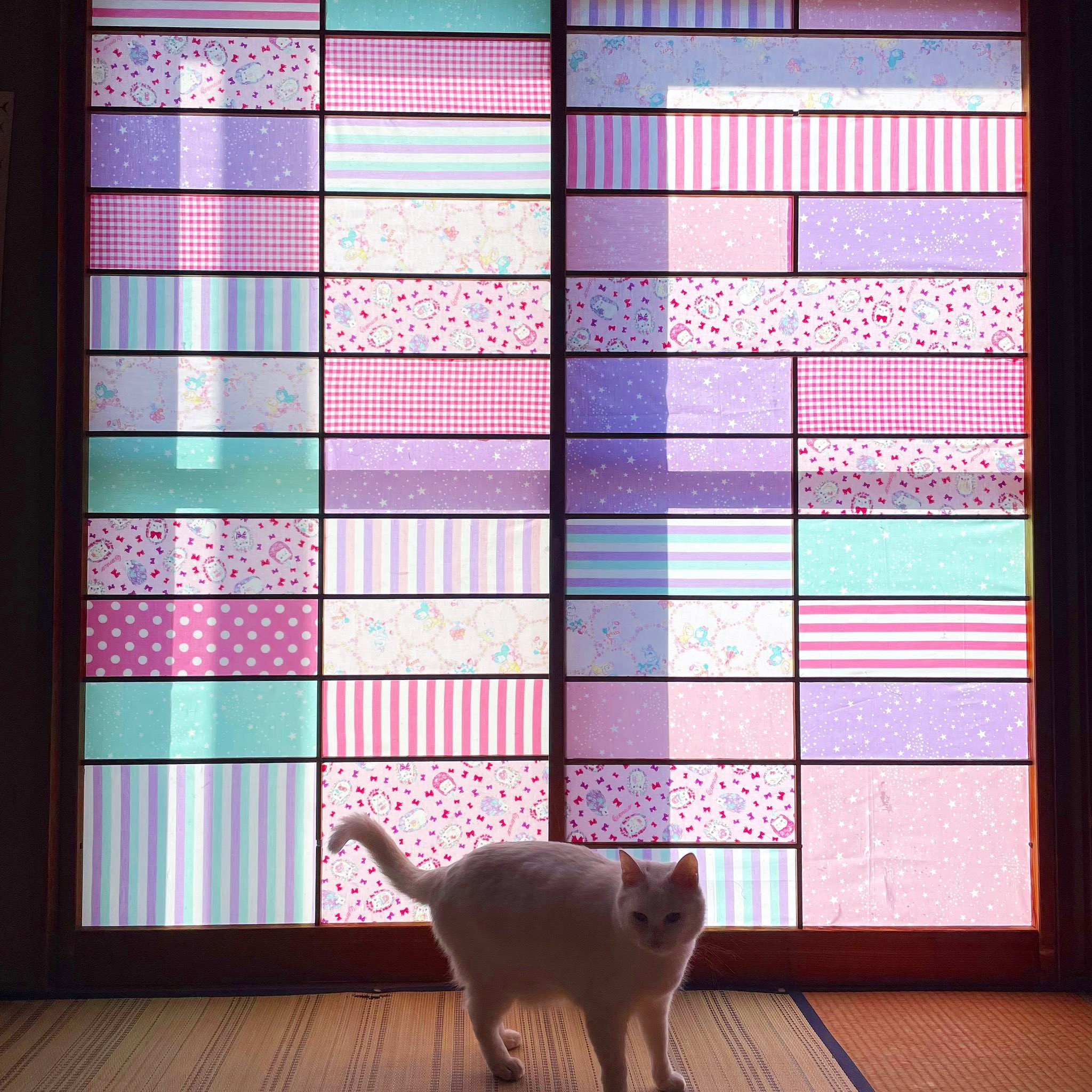 ピンクや紫を基調とした、色鮮やかな障子。誕生した経緯は、猫にズタボロにされ続けてきた結果、柄の異なる数種類の布に張り替えたというものでした。この障子を張ったのは、「アニマルパレード」というブランド名で、パステルカラーの世界観の絵を描いている絵子猫(@ECONECOxxx)さん。画像をTwitterで投稿したところ、現在17.6万件以上のいいねがつくなど、反響を呼んでいます。