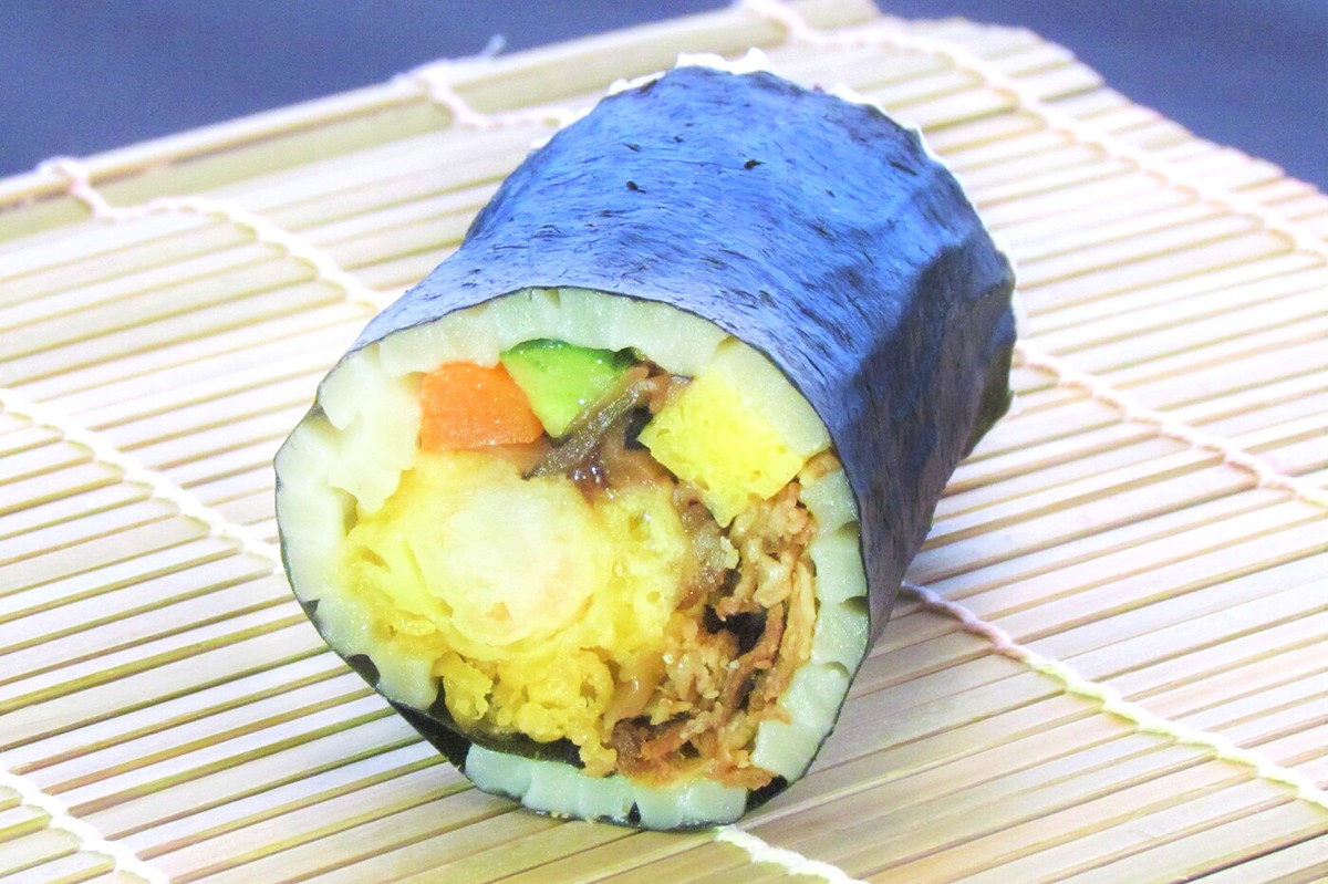 このアイデアを上司も後押しし、海苔の上にうどんを敷き詰め、そこにえび天・牛肉・にんじん・きゅうり・玉子・かんぴょう・椎茸を巻き込んだ「うどん恵方巻」が誕生したのです。讃岐うどんの味を再現するため、うどん出汁のジュレも使用しています。