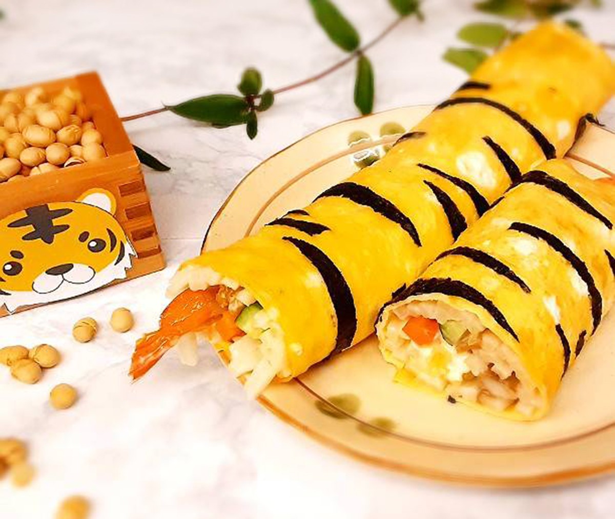 2022年登場の「うどん恵方巻・寅年バージョン」は、愛らしい姿が印象的。表面を錦糸玉子で覆い、海苔で「トラ柄」にした手作りの品。また、具材には骨付鳥味の台湾唐揚げを採用しています。