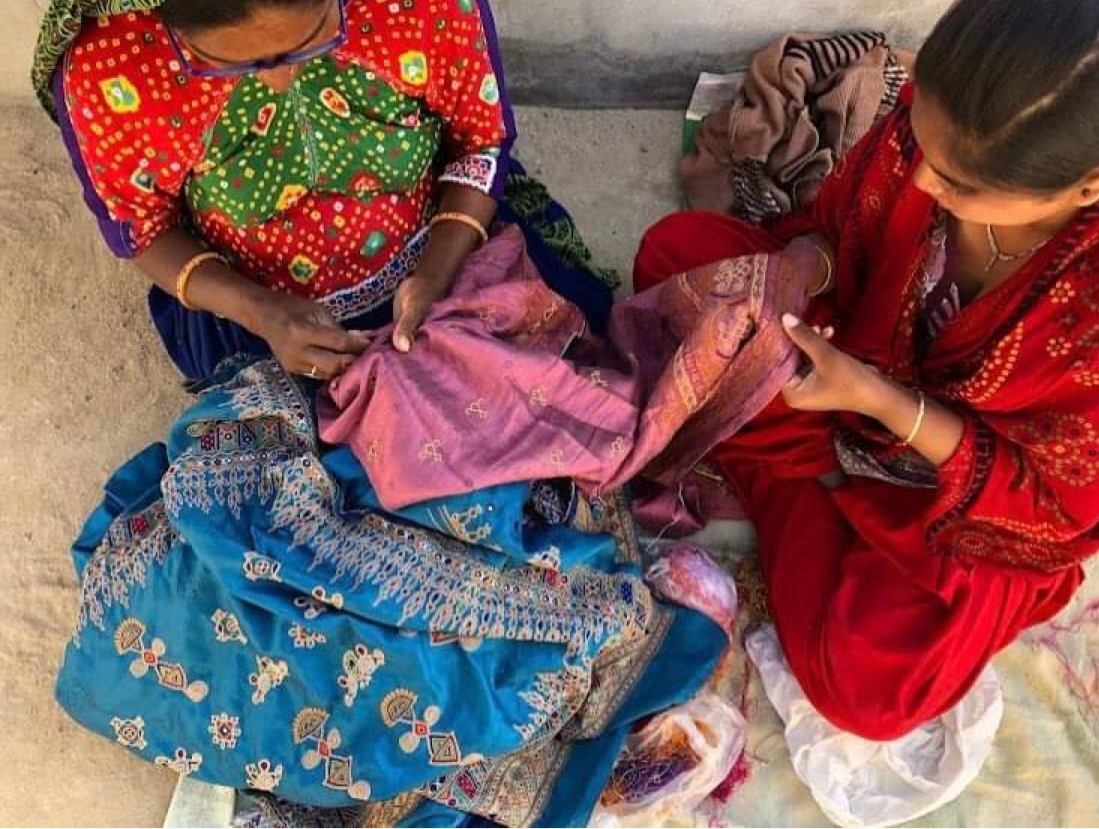 カッチで刺繍をしているのは、もともと遊牧民だった少数民族の人々。ミラーワークは魔除けの意味合いもあり、刺繍は家族を守るために作られることが多い。