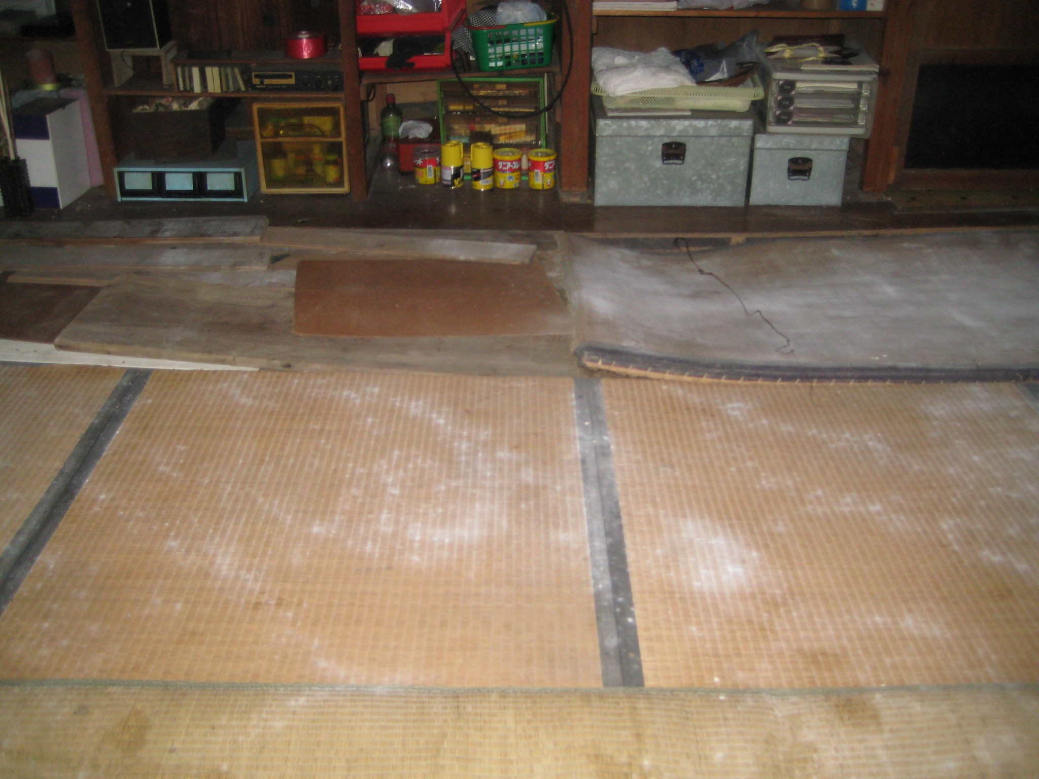 家の周りは竹藪で囲まれ、家もツルに覆われていた。中に入ると畳はカビて、畳を剥がすと床は朽ち、物が大量に残されていた。この状態から業者は通さず、すべて自前で修繕したという。