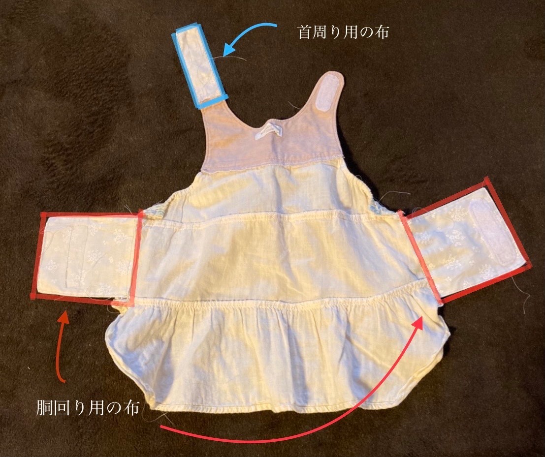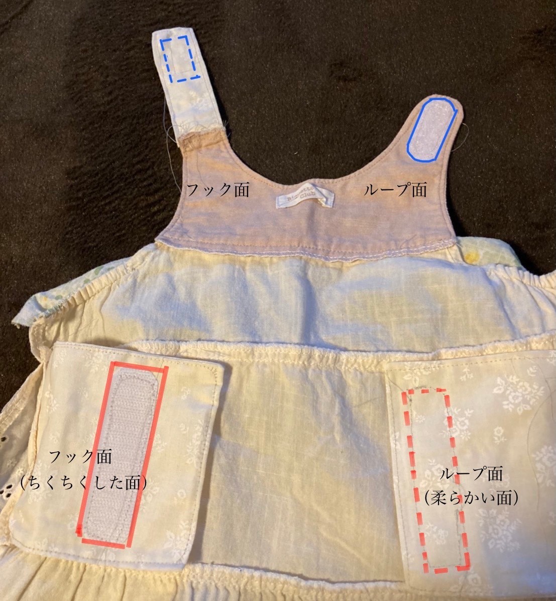 (5)胴回りの布2枚、首回りの布、ワンピースの本体(首回りの布の対になる部分)に大きさの同じマジックテープが対になるよう縫いつける。