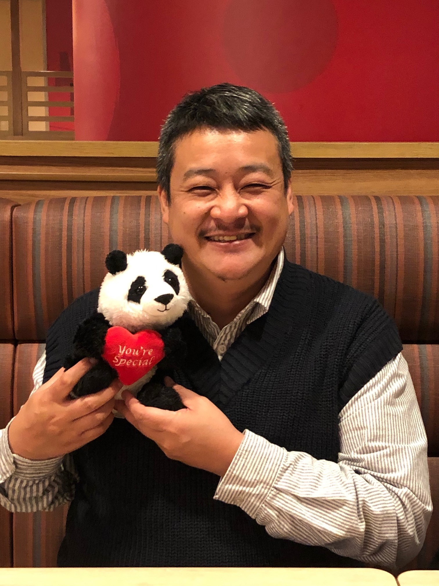小さなパンダのぬいぐるみを携えて待ち合わせ場所に現れたのは赤木大介さん。恰幅のよい体躯と口元にヒゲを生やした雰囲気と、パンダを抱えているチャーミングな姿にはギャップを感ぜずにいられない。