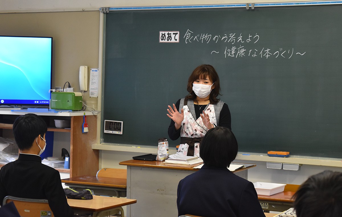 2021年12月には、食育アドバイザーとして、岡山市立石井中学校で『食べ物から考えよう〜健康な身体作り〜』という授業を行いました。