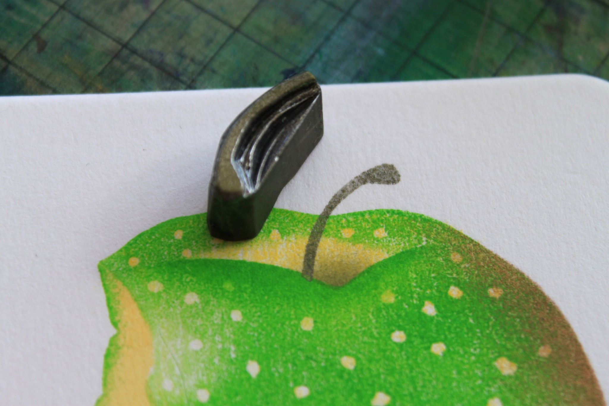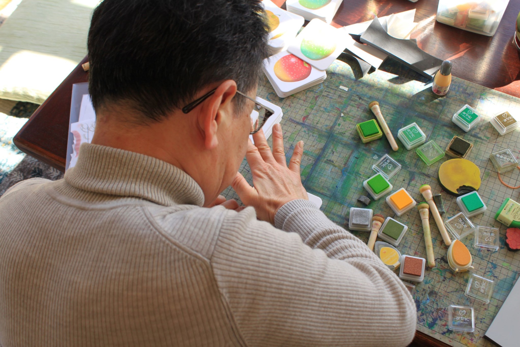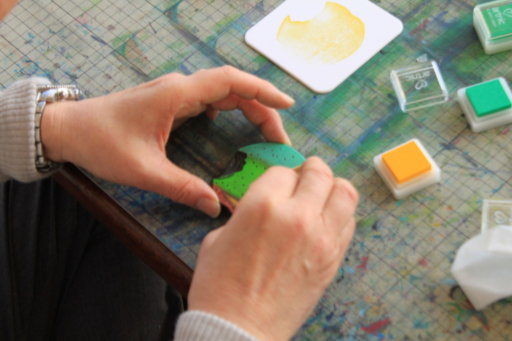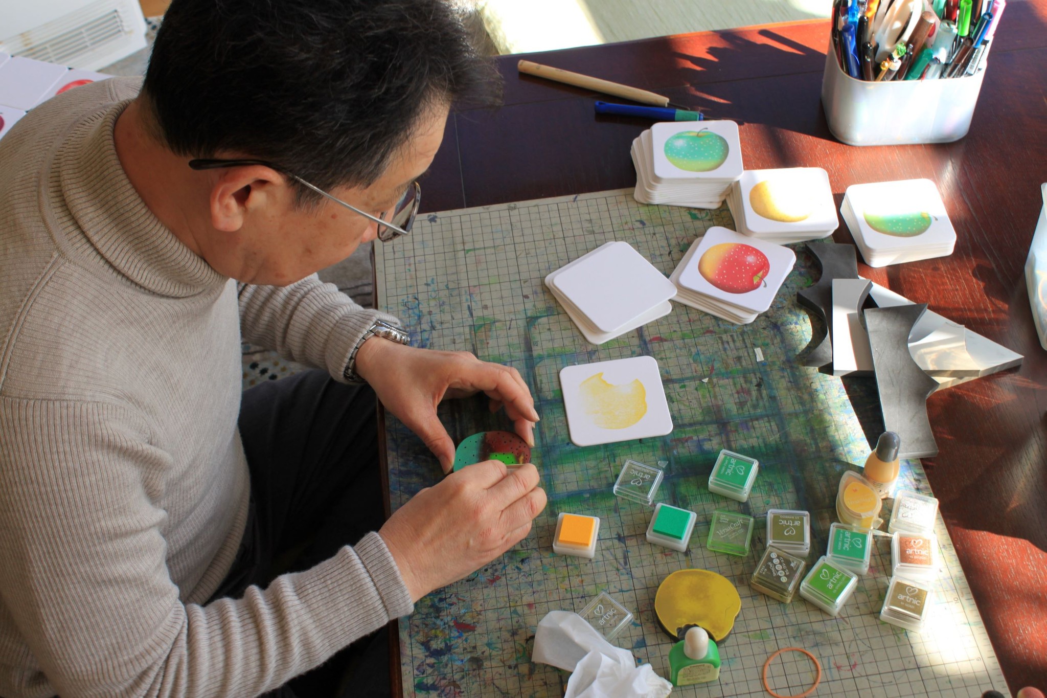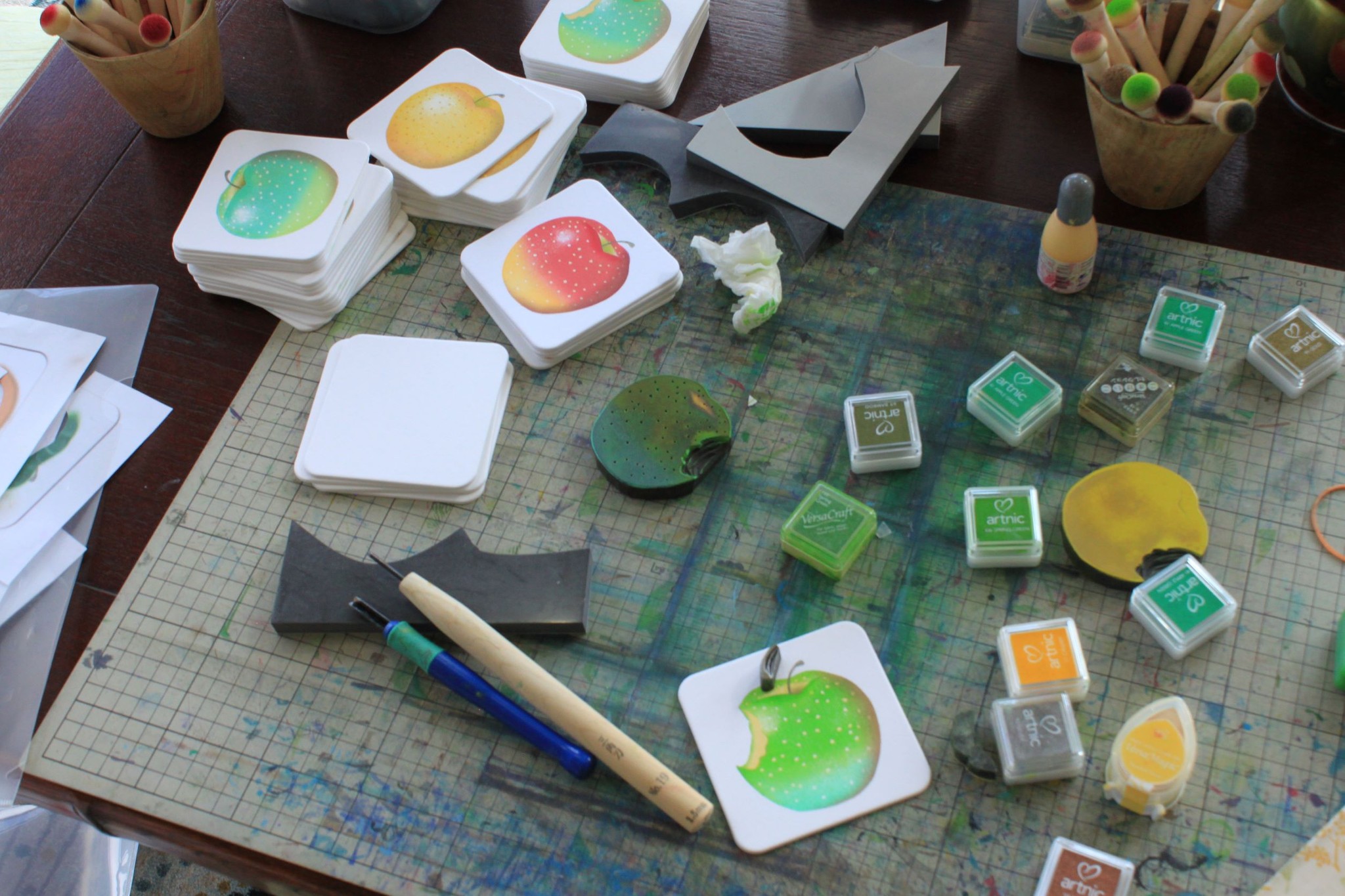 リンゴの版画を制作する過程を見せてもらいました。すでに彫ってある消しゴムの上で、インクをポンポンポンっと調合していきます。
