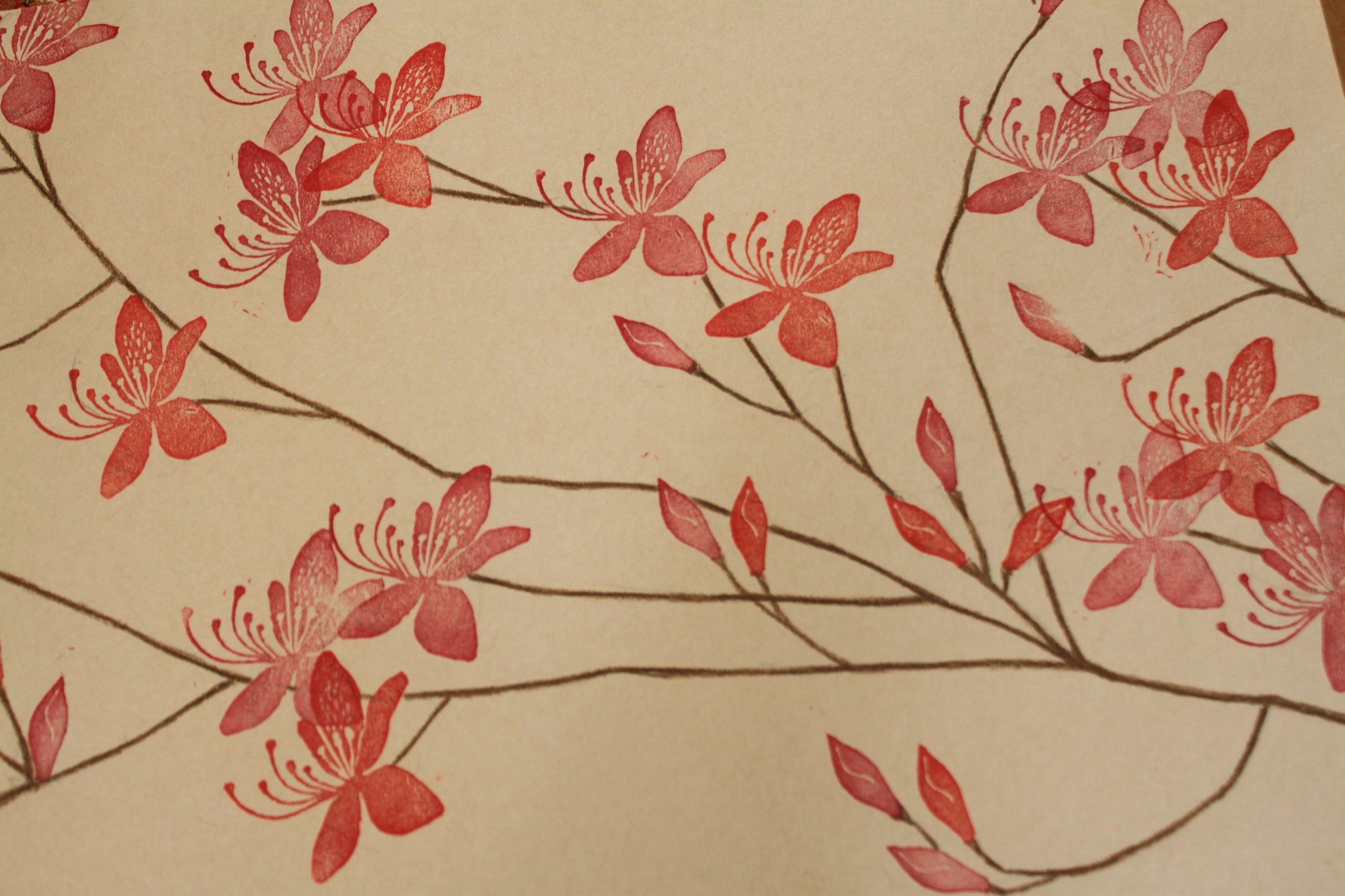 こちらは、始めて5か月目くらいに制作した作品「ツツジ」。赤を2種類使い分け、つぼみも付いています。よく見ると、この頃はまだ、枝の部分は色鉛筆で描いています。